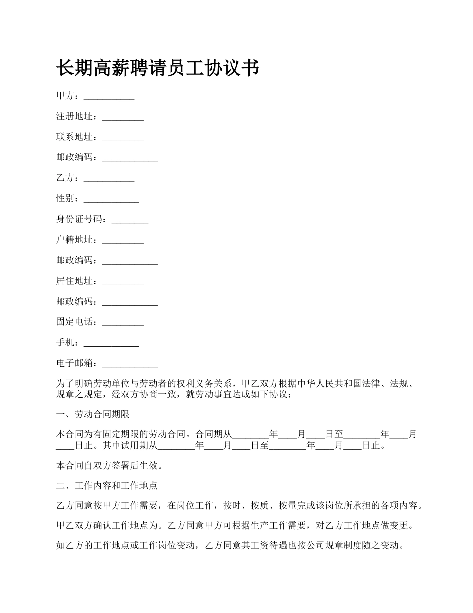 长期高薪聘请员工协议书甲方:___________注册地址:_________联系地址:_________邮政编码:____________乙方:___________性别:____________身份证号码:________户籍地址:_________邮政编码:____________居...