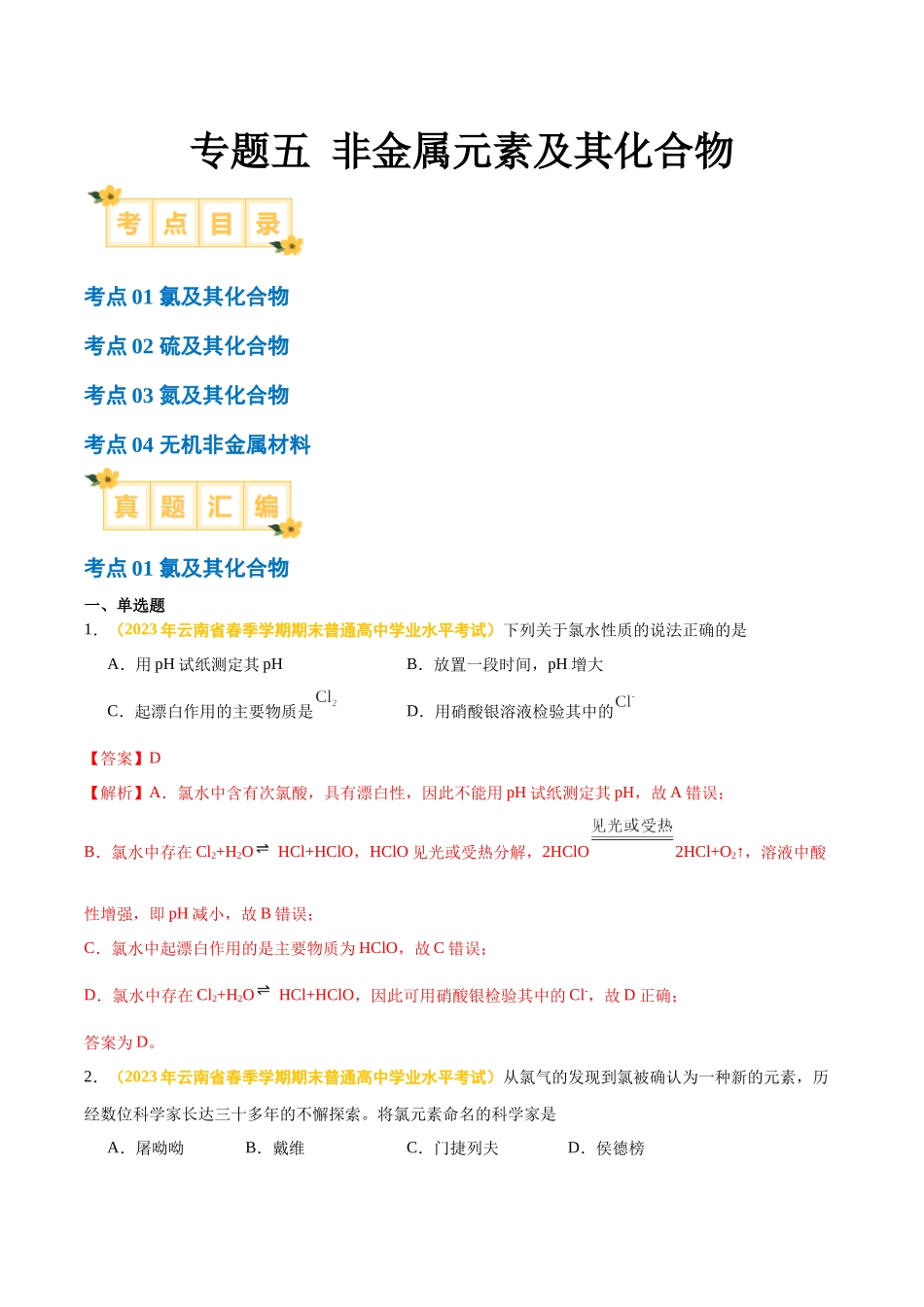 专题五非金属元素及其化合物考点01氯及其化合物考点02硫及其化合物考点03氮及其化合物考点04无机非金属材料考点01氯及其化合物一、单选题1.(2023年云南省春季学期期末普通高中学业水平考试)下列关于氯水性质的...