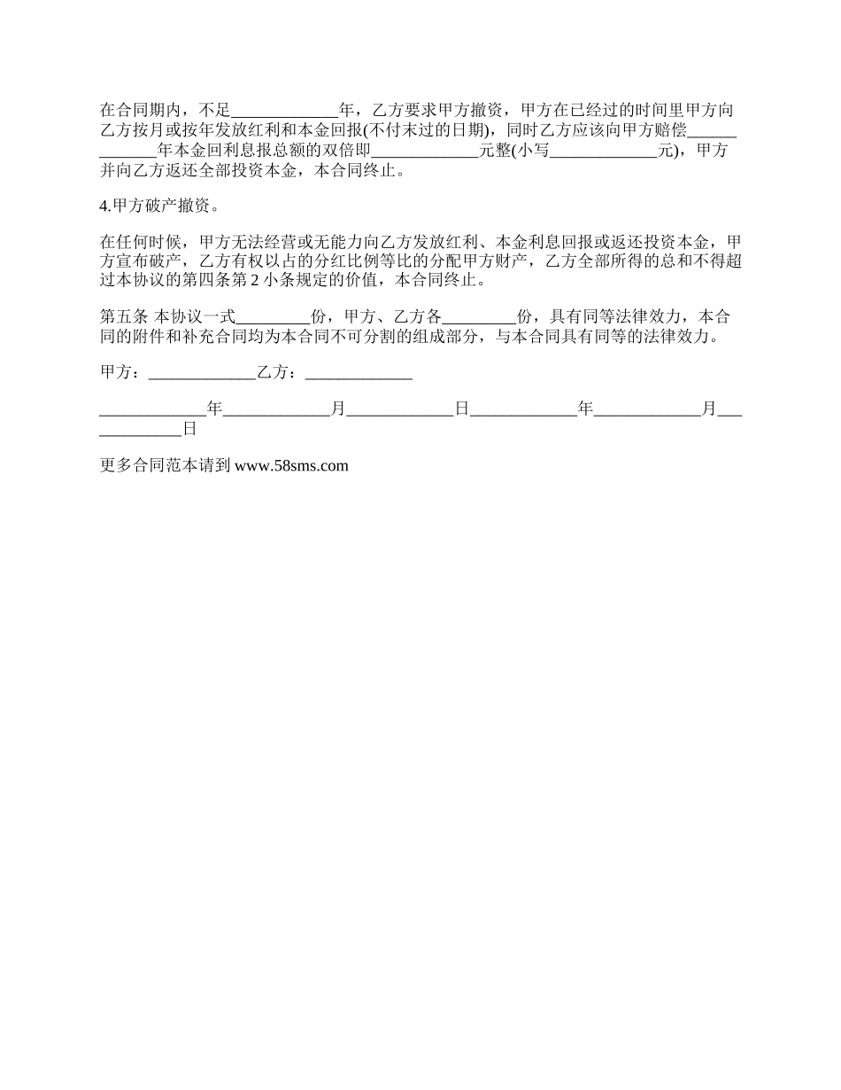 投资及分红协议甲方:_____________乙方:__________________________(以下简称“甲方”)现因发展需要,_____________(以下简称“乙方”)向甲方投入资金人民币__________元整(小写__________元),经过双方友好协...