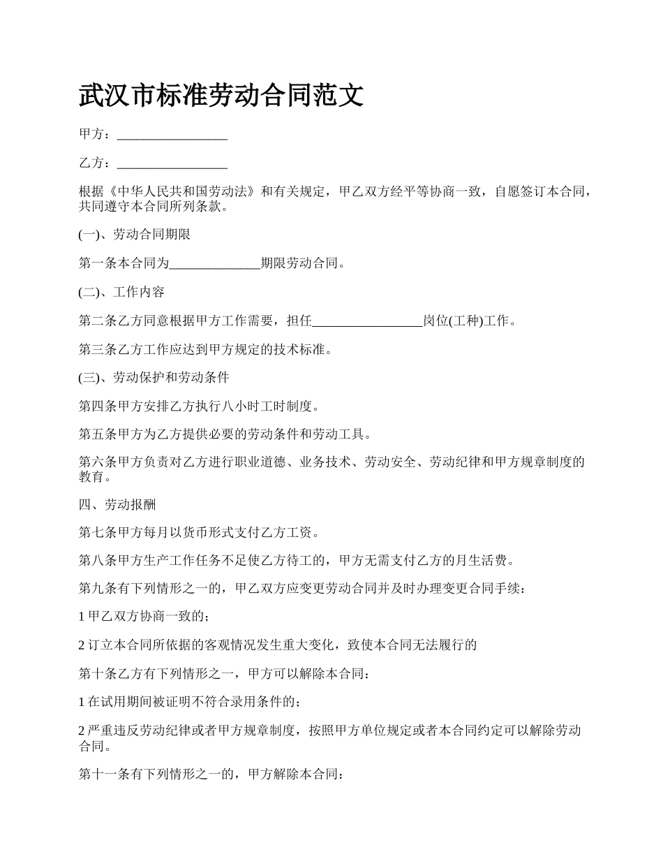 武汉市标准劳动合同范文甲方:_________________乙方:_________________根据《中华人民共和国劳动法》和有关规定,甲乙双方经平等协商一致,自愿签订本合同,共同遵守本合同所列条款。(一)、劳动合同期限第一条...