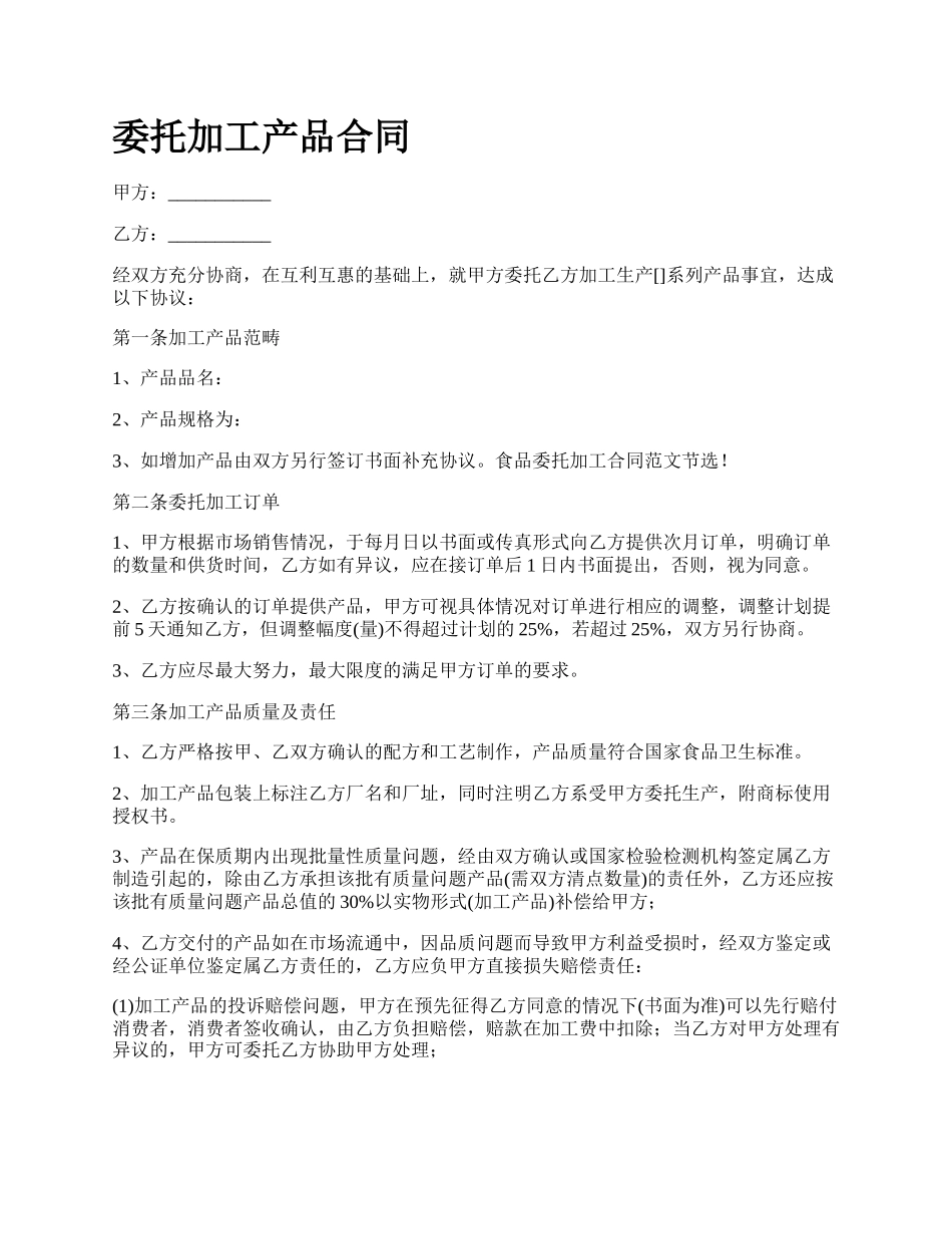 委托加工产品合同甲方:___________乙方:___________经双方充分协商,在互利互惠的基础上,就甲方委托乙方加工生产[]系列产品事宜,达成以下协议:第一条加工产品范畴1、产品品名:2、产品规格为:3、如增加产品...