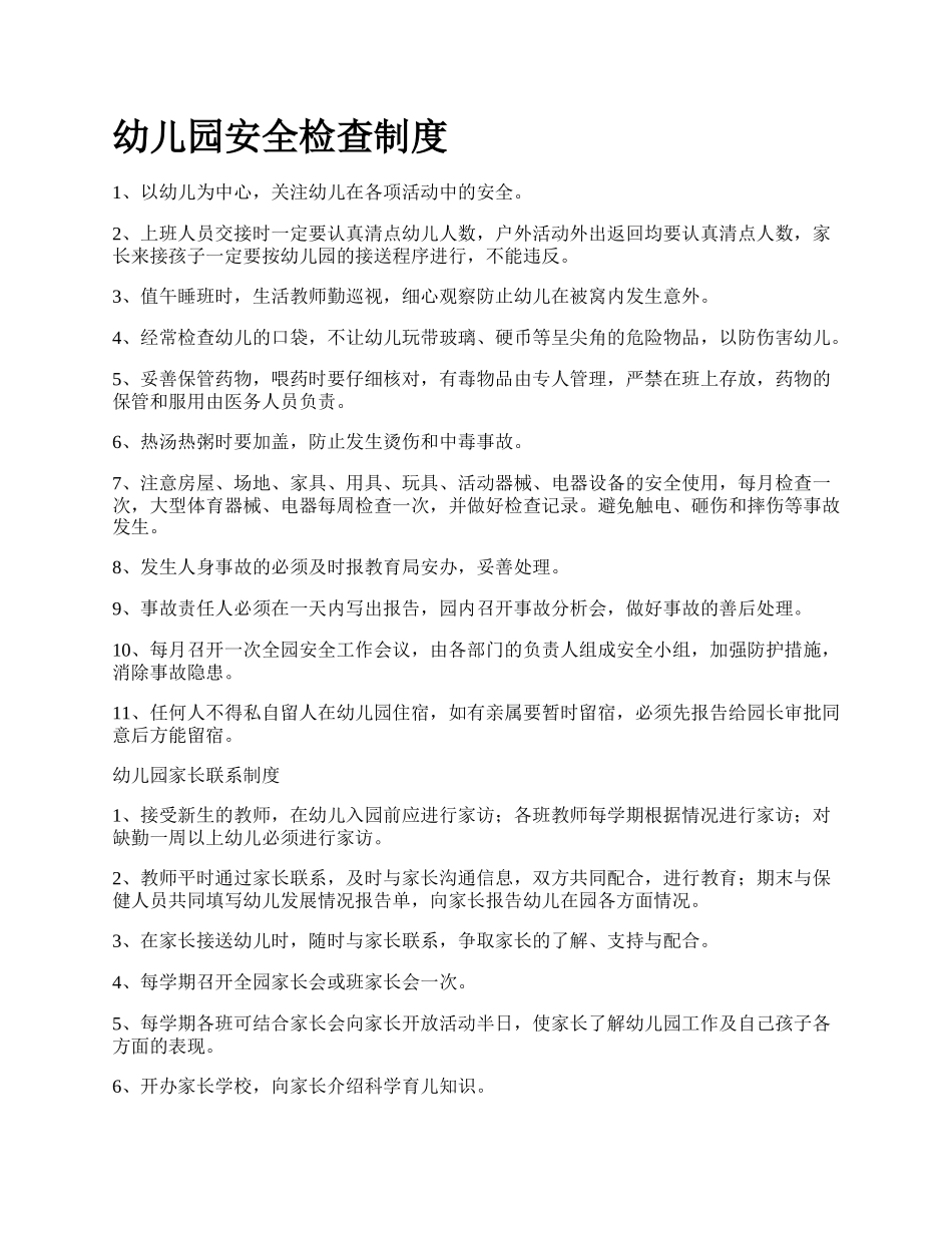 幼儿园安全检查制度1、以幼儿为中心,关注幼儿在各项活动中的安全。2、上班人员交接时一定要认真清点幼儿人数,户外活动外出返回均要认真清点人数,家长来接孩子一定要按幼儿园的接送程序进行,不能违反。3、值午...