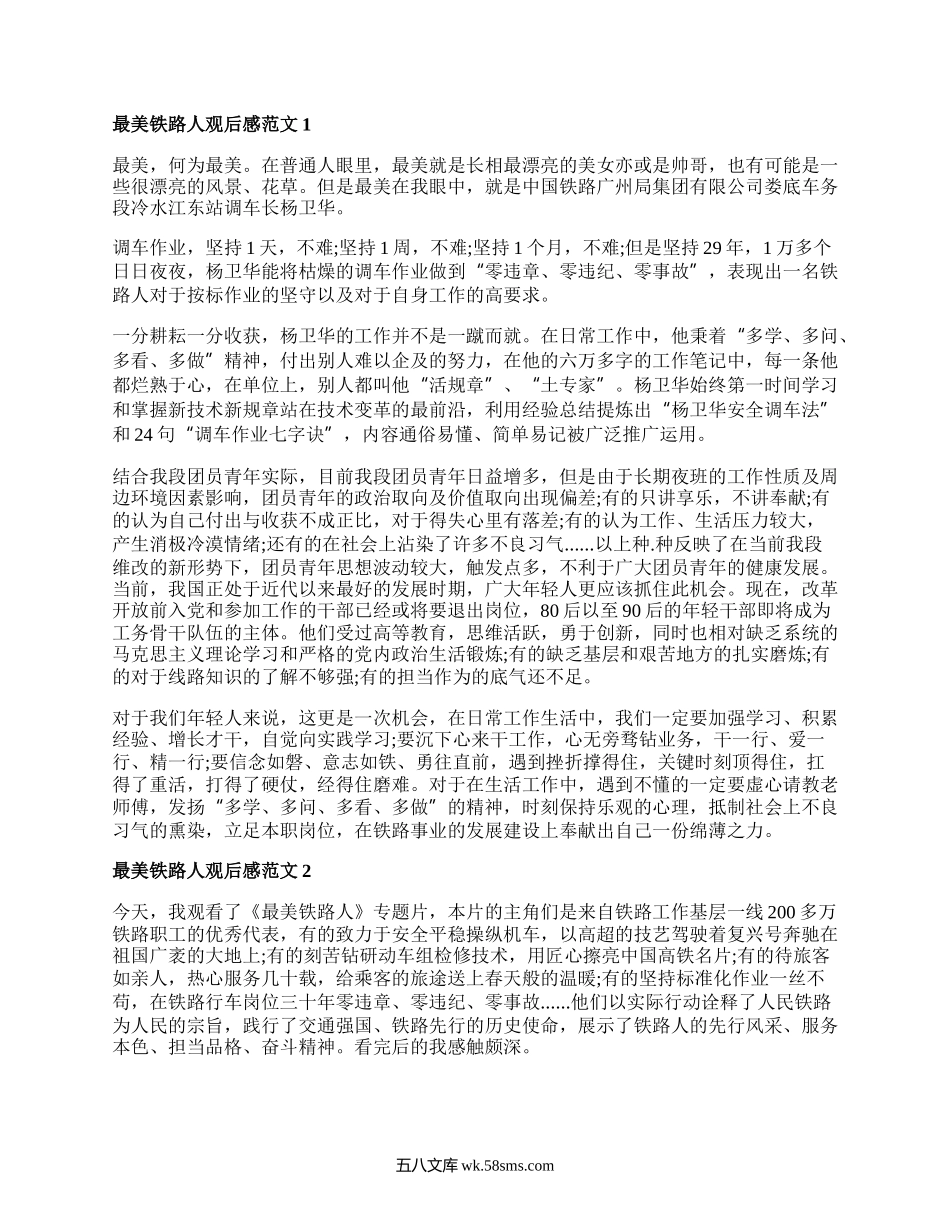 最美铁路人观后感范文1最美,何为最美。在普通人眼里,最美就是长相最漂亮的美女亦或是帅哥,也有可能是一些很漂亮的风景、花草。但是最美在我眼中,就是中国铁路广州局集团有限公司娄底车务段冷水江东站调车长杨...