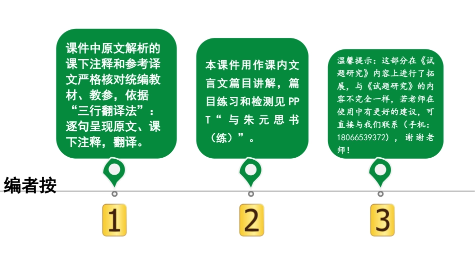 课件中原文解析的课下注释和参考译文严格核对统编教材、教参,依据“三行翻译法”:逐句呈现原文、课下注释,翻译。本课件用作课内文言文篇目讲解,篇目练习和检测见PPT“与朱元思书(练)”。编者按温馨提示:这...