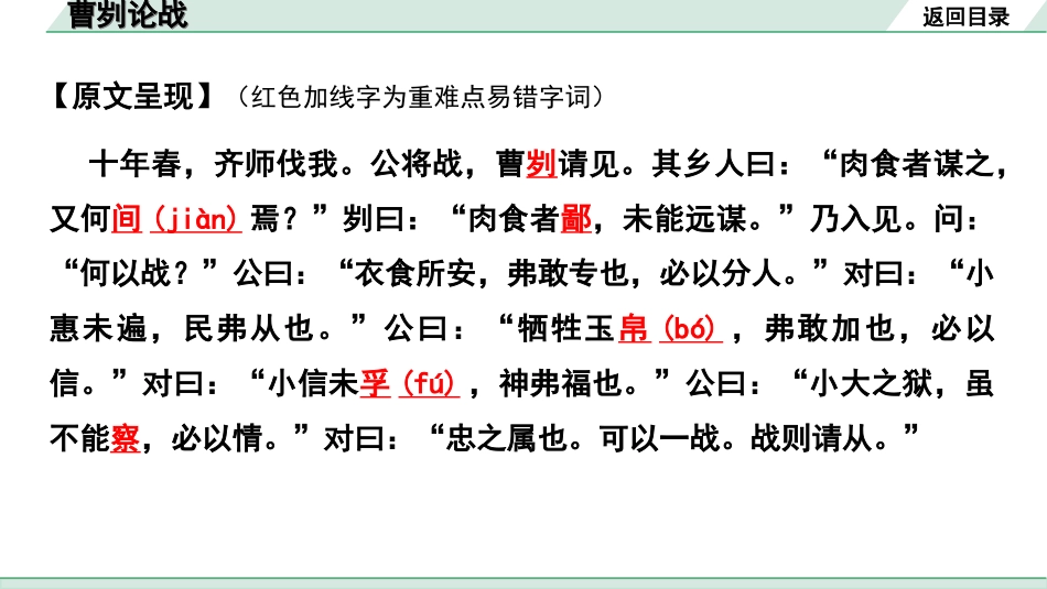 中考贵阳语文2.第二部分  阅读能力_5.古代诗文阅读_1.专题一 文言文阅读_1.一阶 教材文言文逐篇梳理及课外对接_第4篇 曹刿论战_曹刿论战“三行翻译法” (讲).ppt_第2页