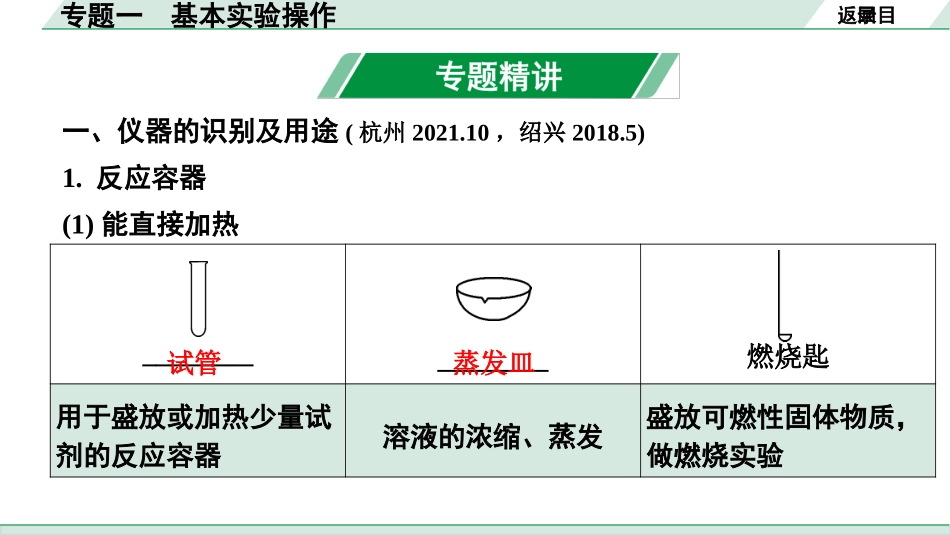 目录目录专题一基本实验操作专题训练2专题精讲1专题一基本实验操作返回目录一、仪器的识别及用途(杭州2021.10,绍兴2018.5)1.反应容器(1)能直接加热________________燃烧匙用于盛放或加热少量试剂的反应容器溶液...