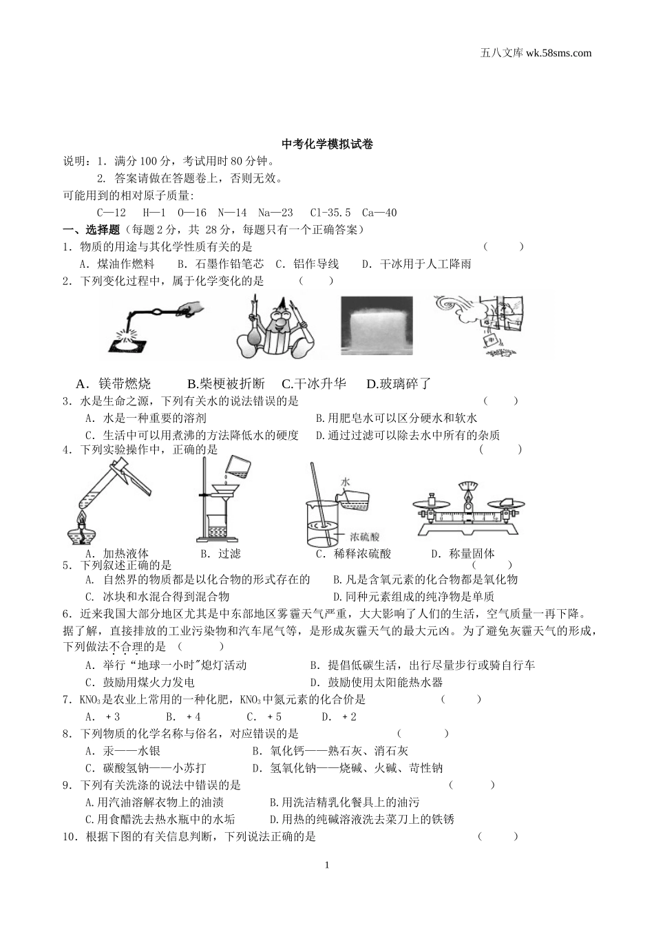 五八文库wk.58sms.com中考化学模拟试卷说明:1.满分100分,考试用时80分钟。2.答案请做在答题卷上,否则无效。可能用到的相对原子质量:C—12H—1O—16N—14Na—23Cl-35.5Ca—40一、选择题(每题2分,共28分,每...