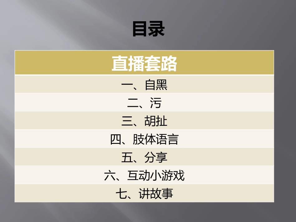 直播套路目录直播套路一、自黑二、污三、胡扯四、肢体语言五、分享六、互动小游戏七、讲故事一、岗前准备准备1、形象准备2、歌单准备3、段子二、下播之前(感谢)三、直播套路套路1、自黑套路2、污套路3、胡扯套...