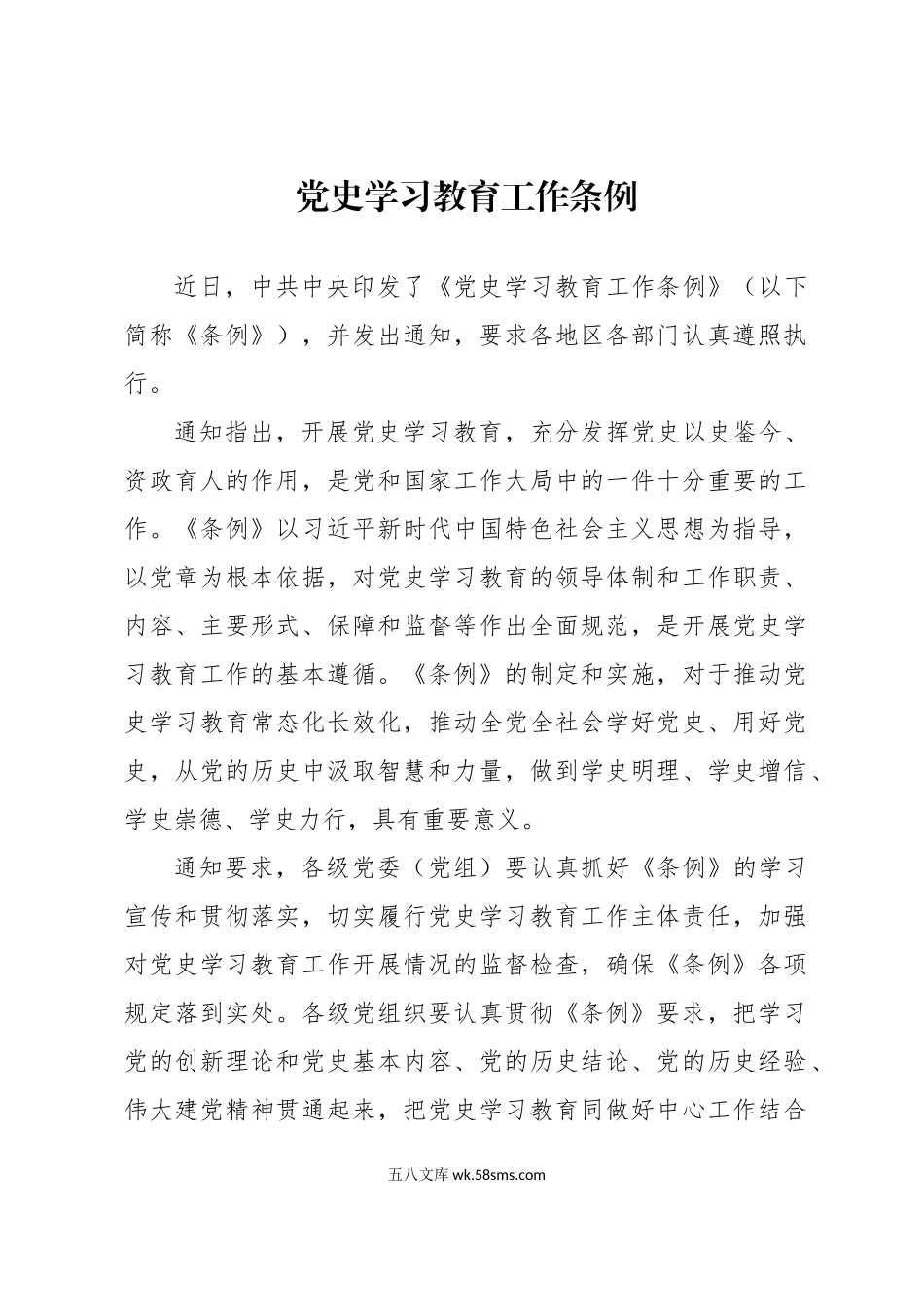 党史学习教育工作条例近日,中共中央印发了《党史学习教育工作条例》(以下简称《条例》),并发出通知,要求各地区各部门认真遵照执行。通知指出,开展党史学习教育,充分发挥党史以史鉴今、资政育人的作用,是...