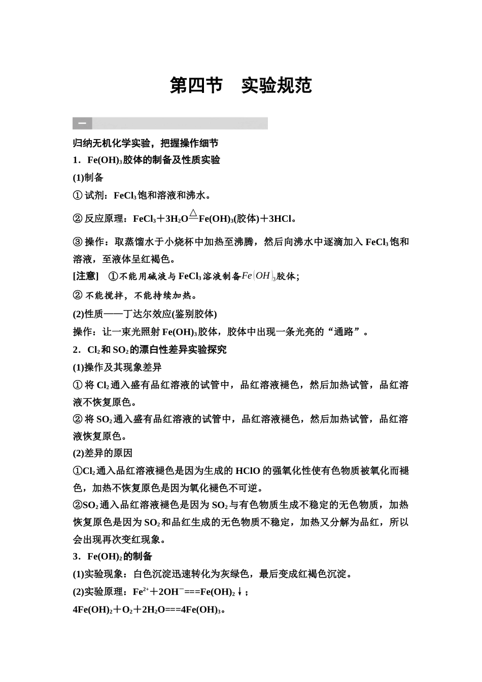 第四节实验规范归纳无机化学实验,把握操作细节1.Fe(OH)3胶体的制备及性质实验(1)制备①试剂:FeCl3饱和溶液和沸水。②反应原理:FeCl3+3H2O△Fe(OH)3(胶体)+3HCl。③操作:取蒸馏水于小烧杯中加热至沸腾,然...