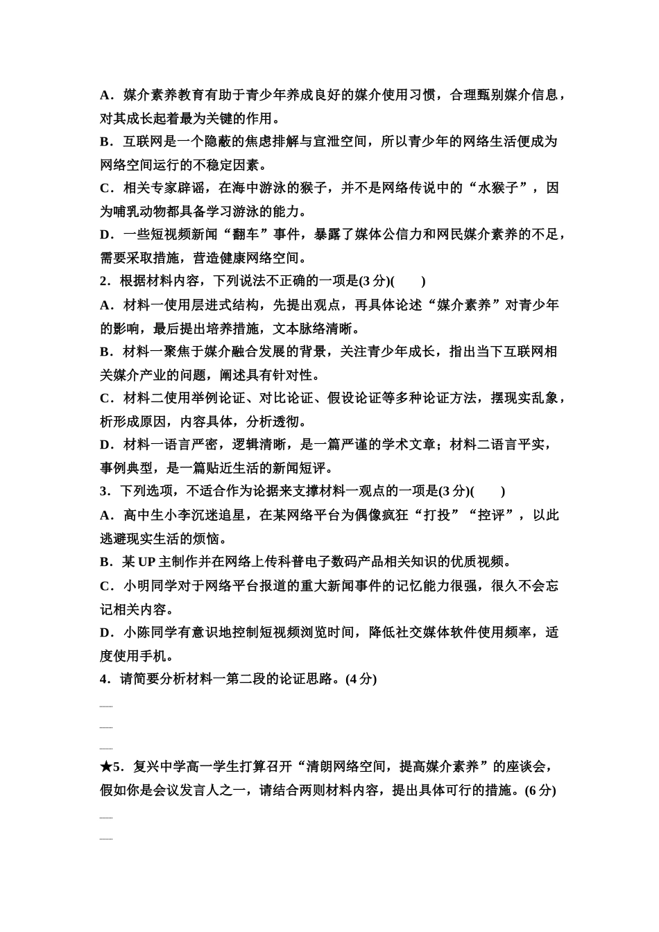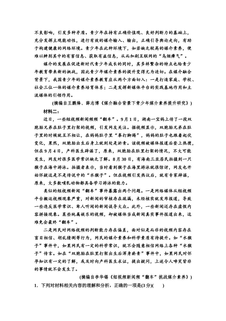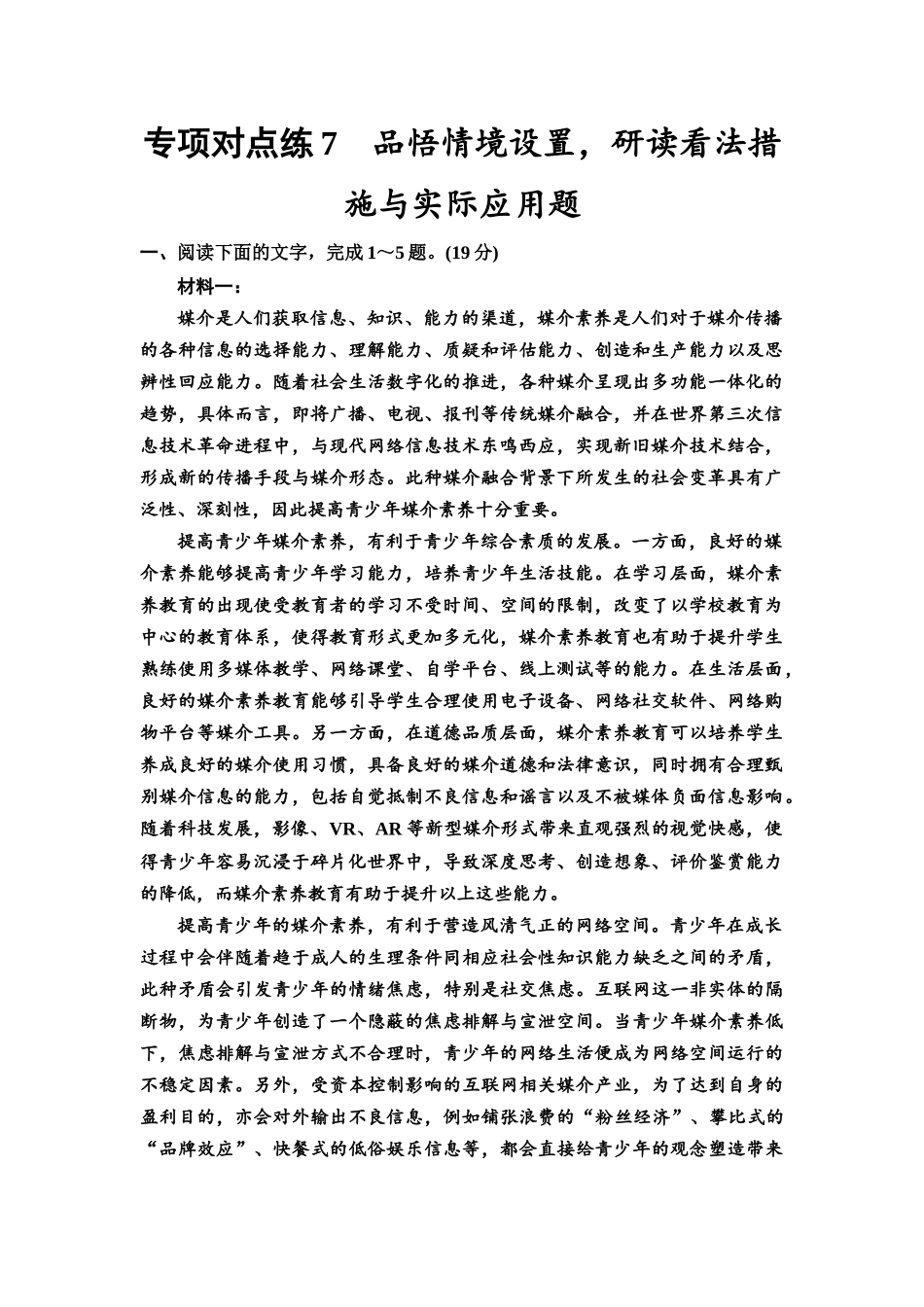 专项对点练7品悟情境设置,研读看法措施与实际应用题一、阅读下面的文字,完成1~5题。(19分)材料一:媒介是人们获取信息、知识、能力的渠道,媒介素养是人们对于媒介传播的各种信息的选择能力、理解能力、质疑和...