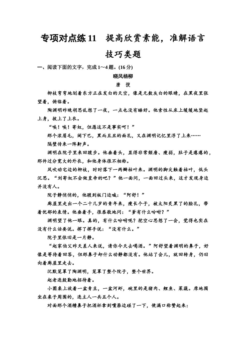专项对点练11提高欣赏素能,准解语言技巧类题一、阅读下面的文字,完成1~4题。(16分)晓风杨柳唐弢柳枝弯弯地划着东方正在发白的天空,像是无数灰白的眼睛,在黑夜里张望着,俯临着。陶渊明昨晚胡思乱想了一夜,...