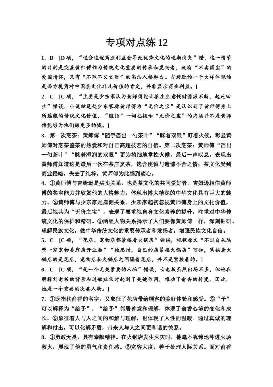 专项对点练121.D[D项,“过分追逐商业利益会导致优秀文化的逐渐消失”错,这一情节的目的是突显黄师傅作为传统文化重要的传承和发扬者,既有“不卖国宝”的爱国情怀,又有“不取不义之财”的高洁人格魅力。吉姆...