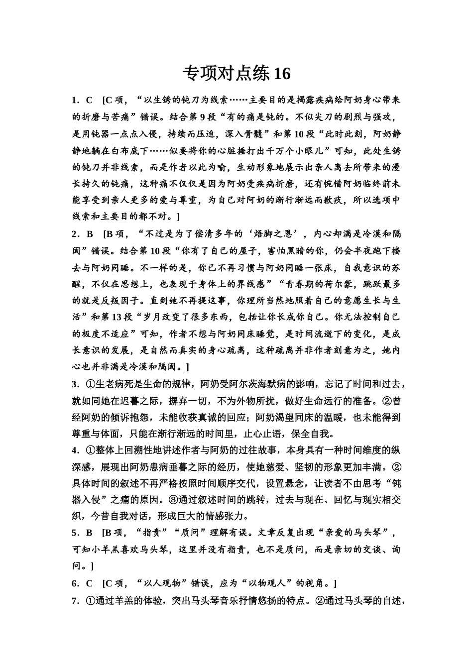 专项对点练161.C[C项,“以生锈的钝刀为线索……主要目的是揭露疾病给阿奶身心带来的折磨与苦痛”错误。结合第9段“有的痛是钝的。不似尖刀的剧烈与强攻,是用钝器一点点入侵,持续而压迫,深入骨髓”和第10段“...