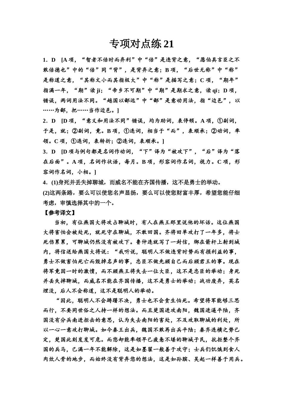 专项对点练211.D[A项,“智者不倍时而弃利”中“倍”是违背之意,“愿伯具言臣之不敢倍德也”中的“倍”同“背”,是背弃之意;B项,“后世无称”中“称”是称道之意,“其称文小而其指极大”中“称”是描写之意...