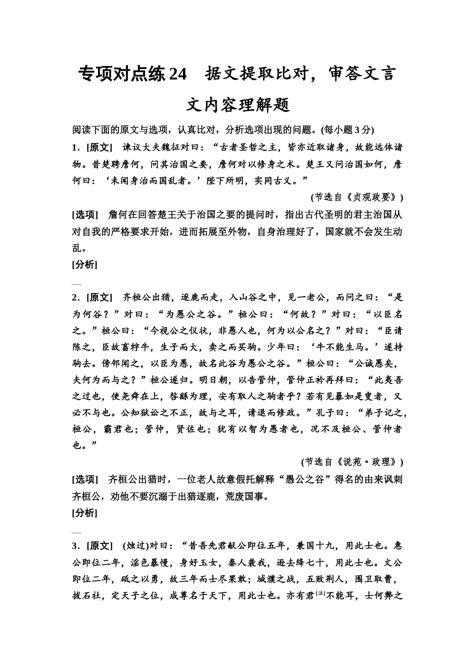 专项对点练24据文提取比对,审答文言文内容理解题阅读下面的原文与选项,认真比对,分析选项出现的问题。(每小题3分)1.[原文]谏议大夫魏征对曰:“古者圣哲之主,皆亦近取诸身,故能远体诸物。昔楚聘詹何,问其...
