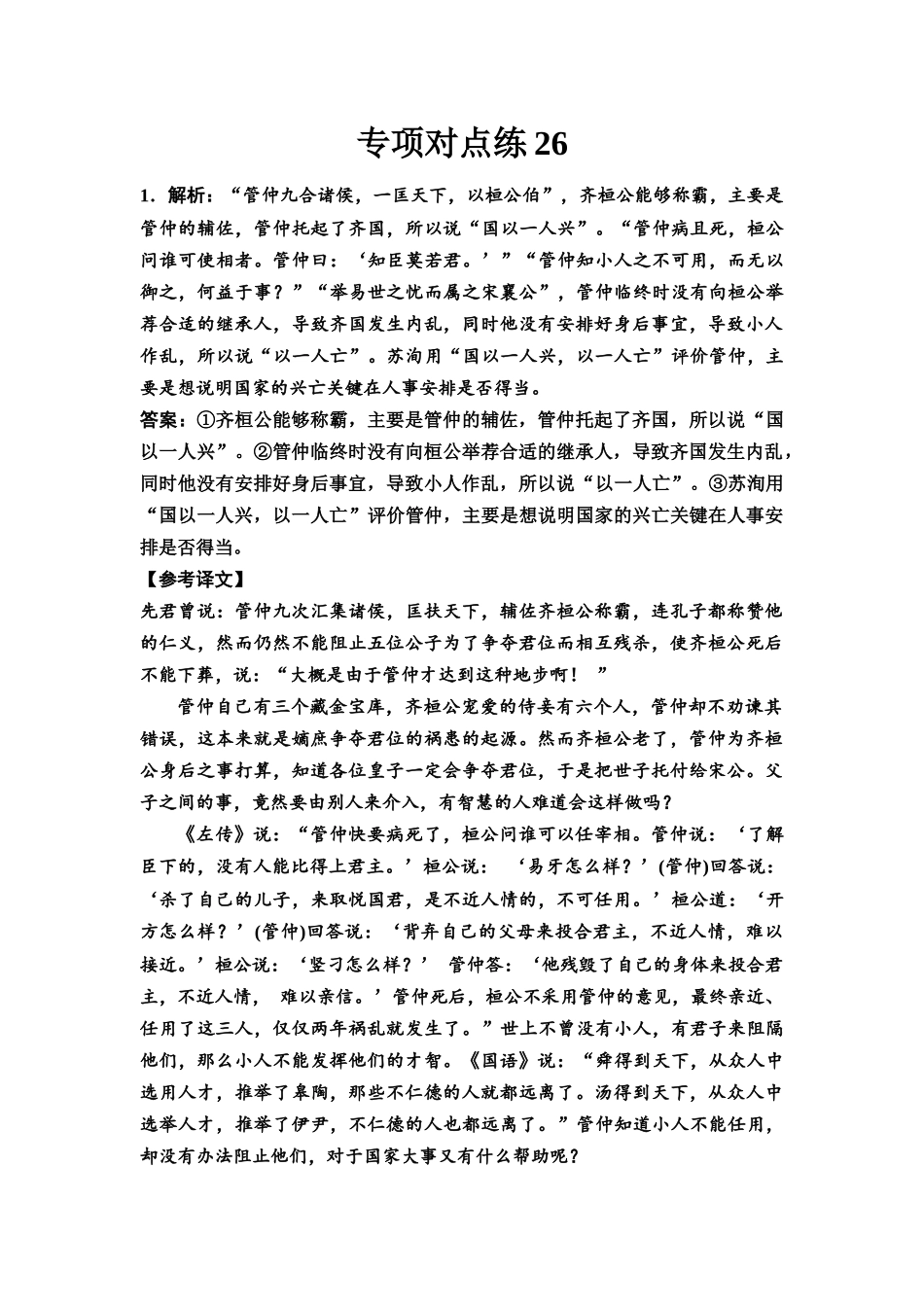 专项对点练261.解析:“管仲九合诸侯,一匡天下,以桓公伯”,齐桓公能够称霸,主要是管仲的辅佐,管仲托起了齐国,所以说“国以一人兴”。“管仲病且死,桓公问谁可使相者。管仲曰:‘知臣莫若君。’”“管仲知...