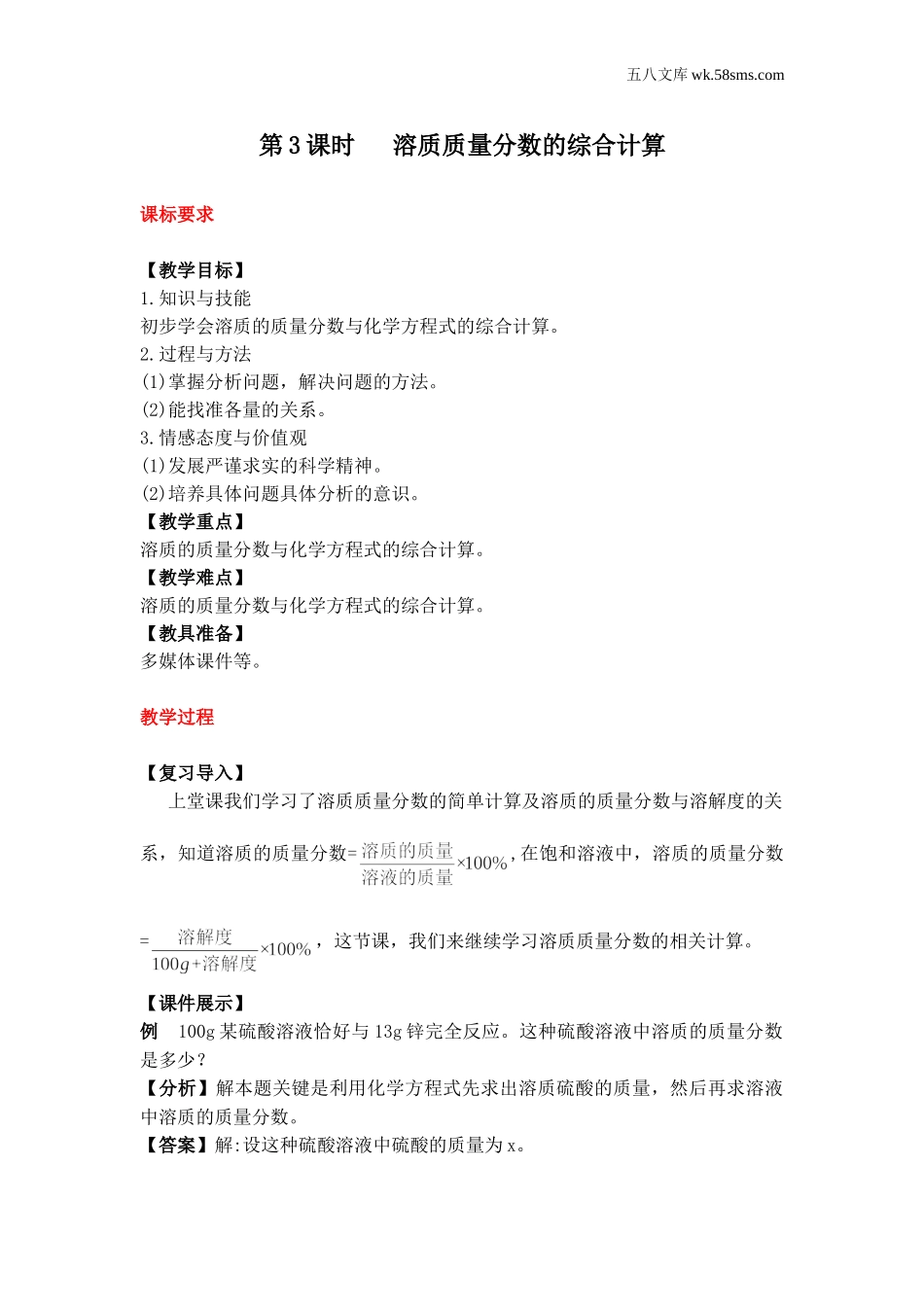 五八文库wk.58sms.com第3课时溶质质量分数的综合计算课标要求【教学目标】1.知识与技能初步学会溶质的质量分数与化学方程式的综合计算。2.过程与方法(1)掌握分析问题,解决问题的方法。(2)能找准各量的关系。3.情...