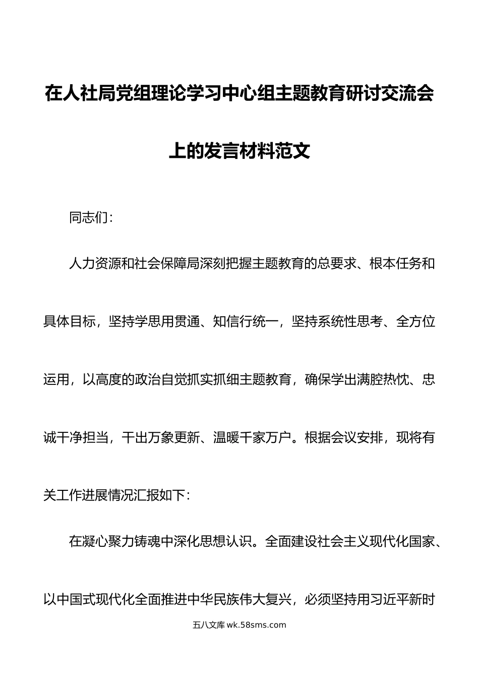 在人社局党组理论学习中心组主题教育研讨交流会上的发言材料范文同志们:人力资源和社会保障局深刻把握主题教育的总要求、根本任务和具体目标,坚持学思用贯通、知信行统一,坚持系统性思考、全方位运用,以高度...