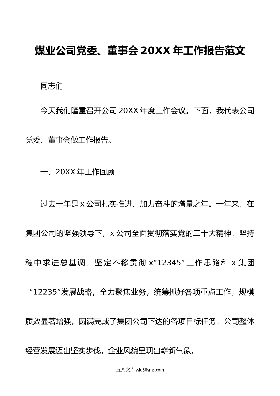 煤业公司党委、董事会20XX年工作报告范文同志们:今天我们隆重召开公司20XX年度工作会议。下面,我代表公司党委、董事会做工作报告。一、20XX年工作回顾过去一年是x公司扎实推进、加力奋斗的增量之年。一年来,在...