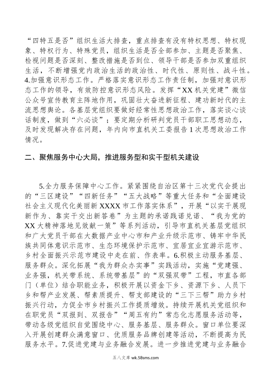 20XX年度市直机关党建工作要点20XX年市直机关党的建设总体要求是:坚持以习近平新时代中国特色社会主义思想为指导,认真贯彻落实党的XX大精神和区、市党代会精神,深刻领悟“两个确立”的决定性意义,增强“四个...