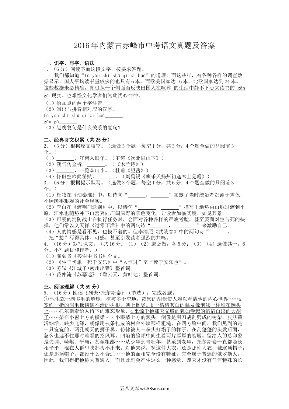 2016年内蒙古赤峰市中考语文真题及答案.doc优质