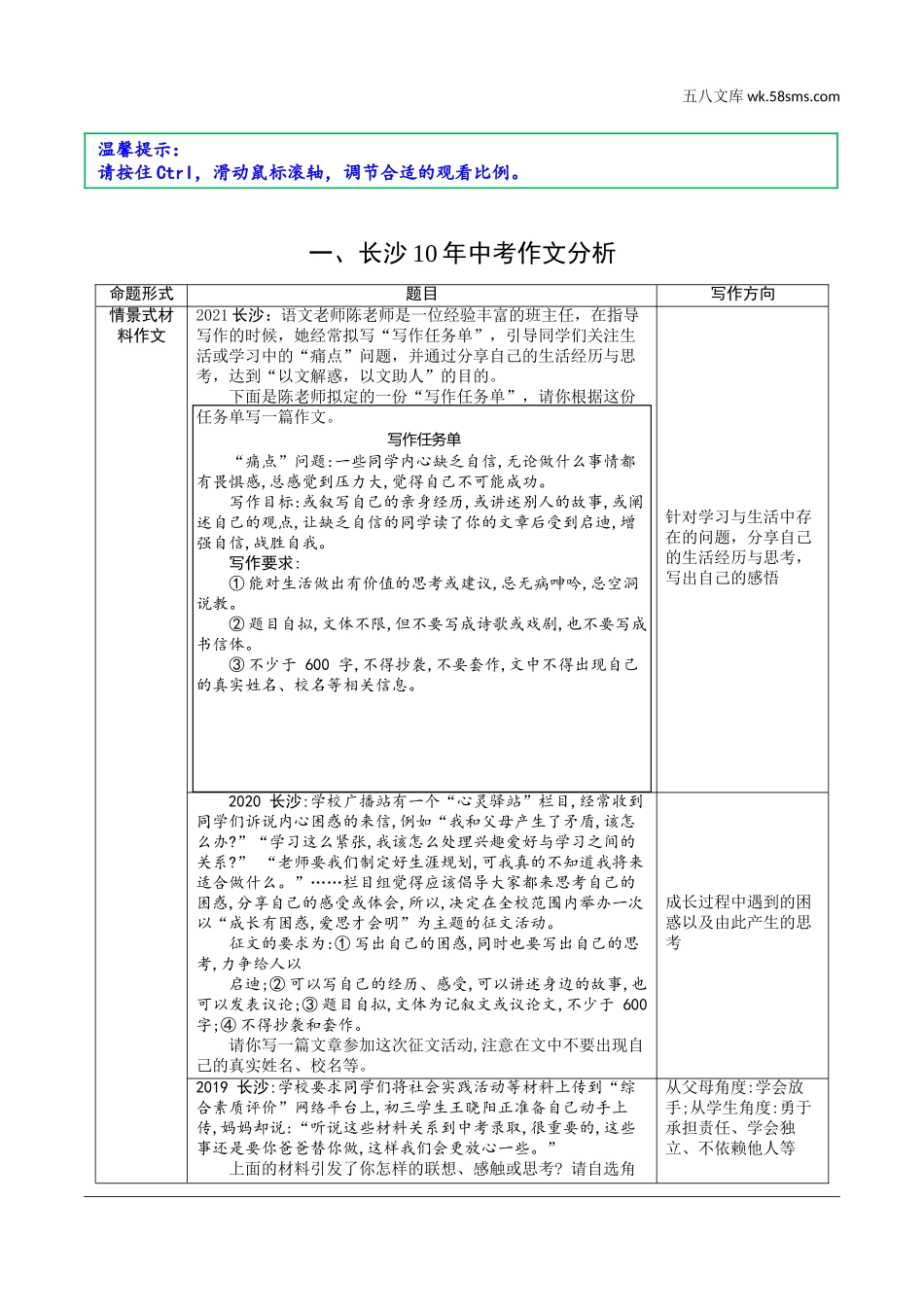 五八文库wk.58sms.com一、长沙10年中考作文分析命题形式题目写作方向情景式材料作文2021长沙:语文老师陈老师是一位经验丰富的班主任,在指导写作的时候,她经常拟写“写作任务单”,引导同学们关注生活或学习中...