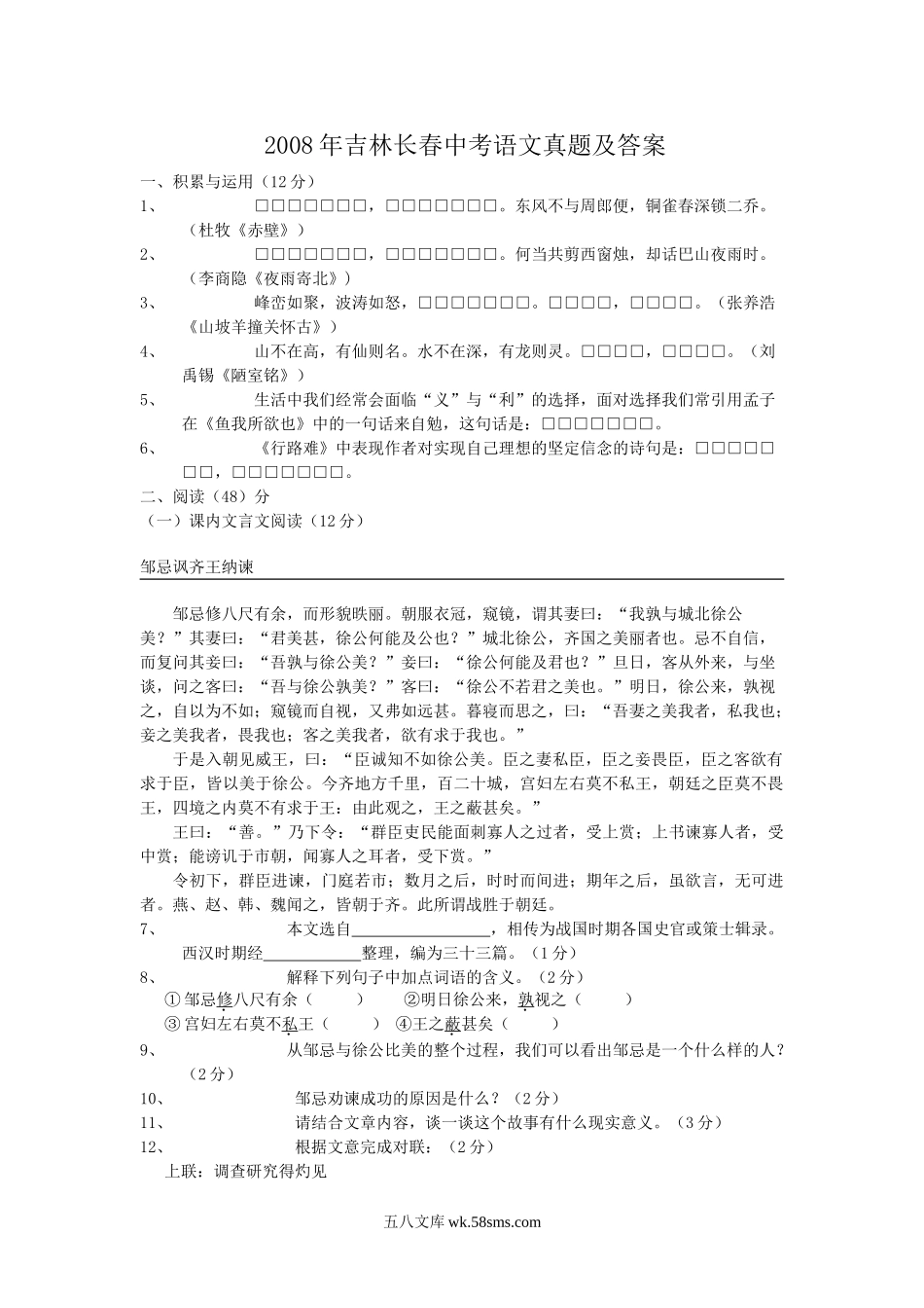 2008年吉林长春中考语文真题及答案.doc优质