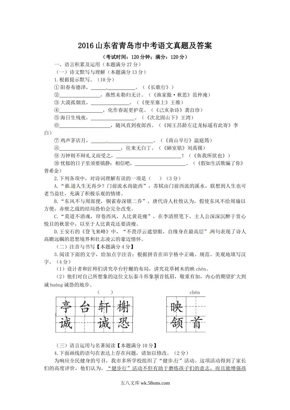 2016山东省青岛市中考语文真题及答案(考试时间:120分钟;满分:120分)一、语言积累及运用(本题满分27分)(一)诗文默写与理解(本题满分13分)1.根据提示默写。(10分)①阳春布德泽,。(《长歌行》)②,...