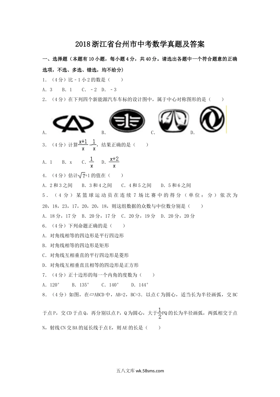 2018浙江省台州市中考数学真题及答案.doc_第1页
