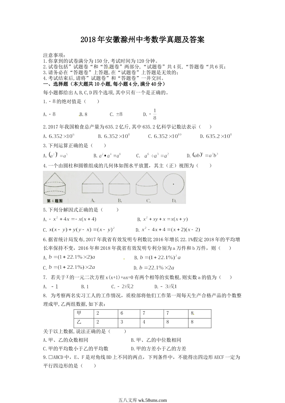 2018年安徽滁州中考数学真题及答案注意事项:1.你拿到的试卷满分为150分,考试时间为120分钟。2.试卷包括”试题卷“和“答题卷”两部分,“试题卷”共4页,“答题卷“共6页;3.请务必在“答题卷”上答题,在“试题卷...