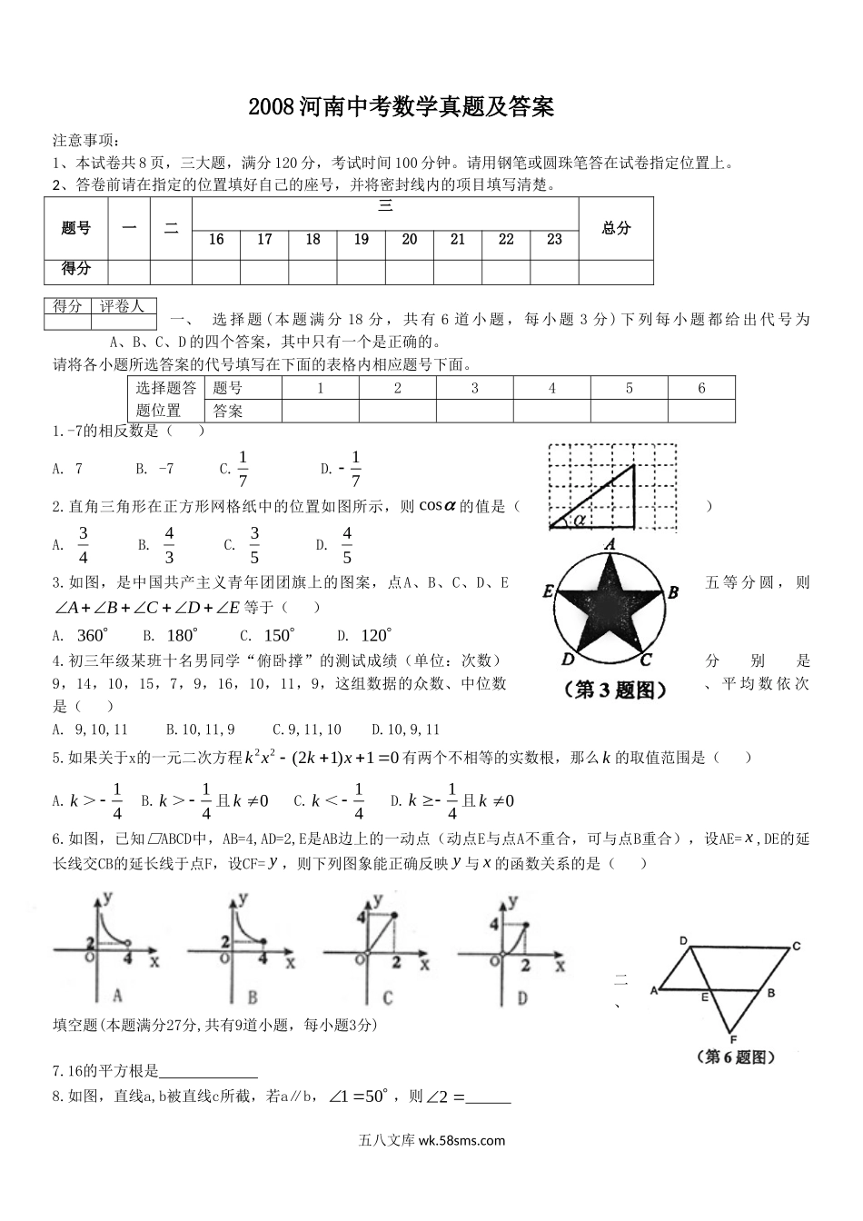 2008河南中考数学真题及答案注意事项:1、本试卷共8页,三大题,满分120分,考试时间100分钟。请用钢笔或圆珠笔答在试卷指定位置上。2、答卷前请在指定的位置填好自己的座号,并将密封线内的项目填写清楚。题号一...