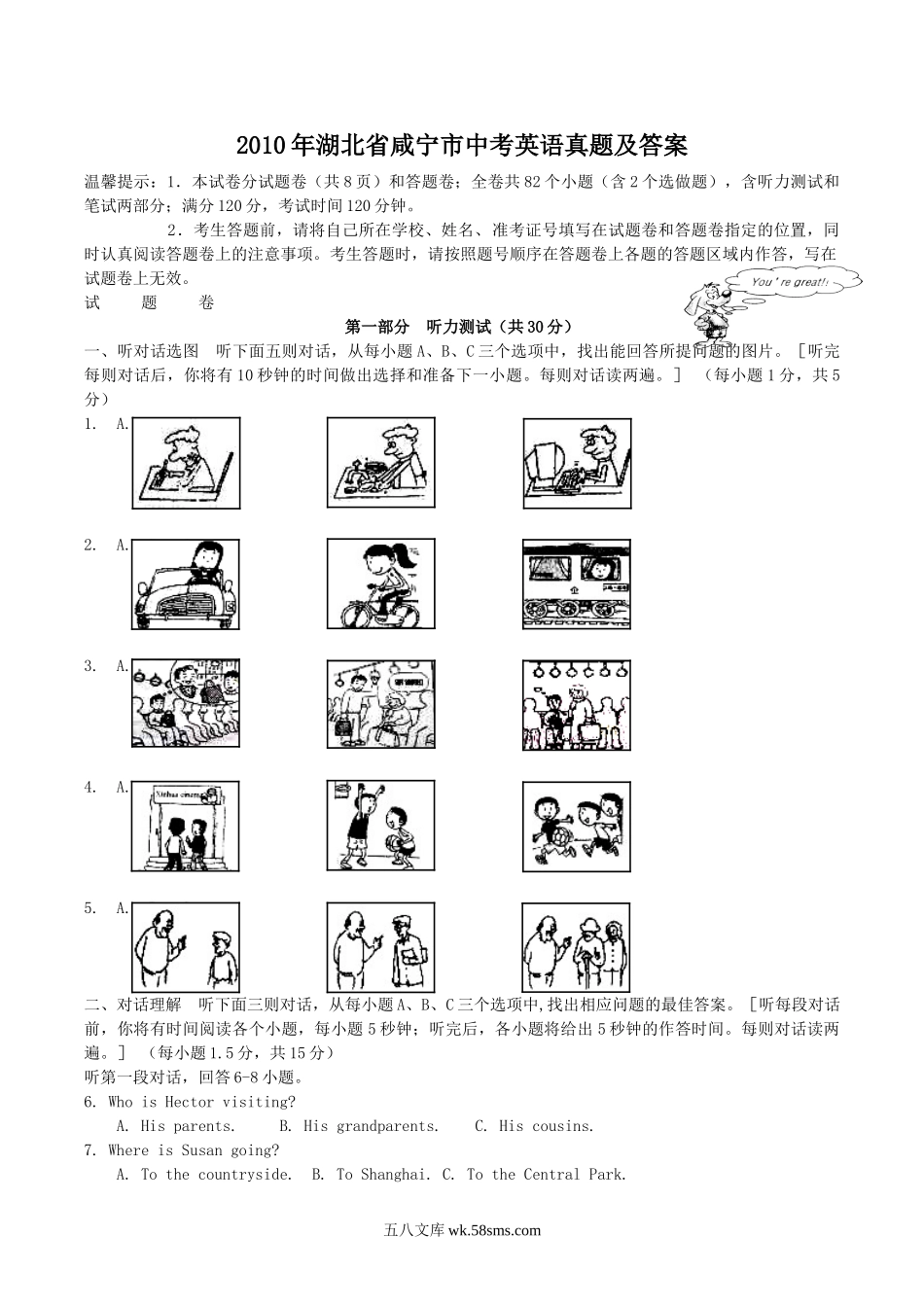 2010年湖北省咸宁市中考英语真题及答案温馨提示:1.本试卷分试题卷(共8页)和答题卷;全卷共82个小题(含2个选做题),含听力测试和笔试两部分;满分120分,考试时间120分钟。2.考生答题前,请将自己所在学校...