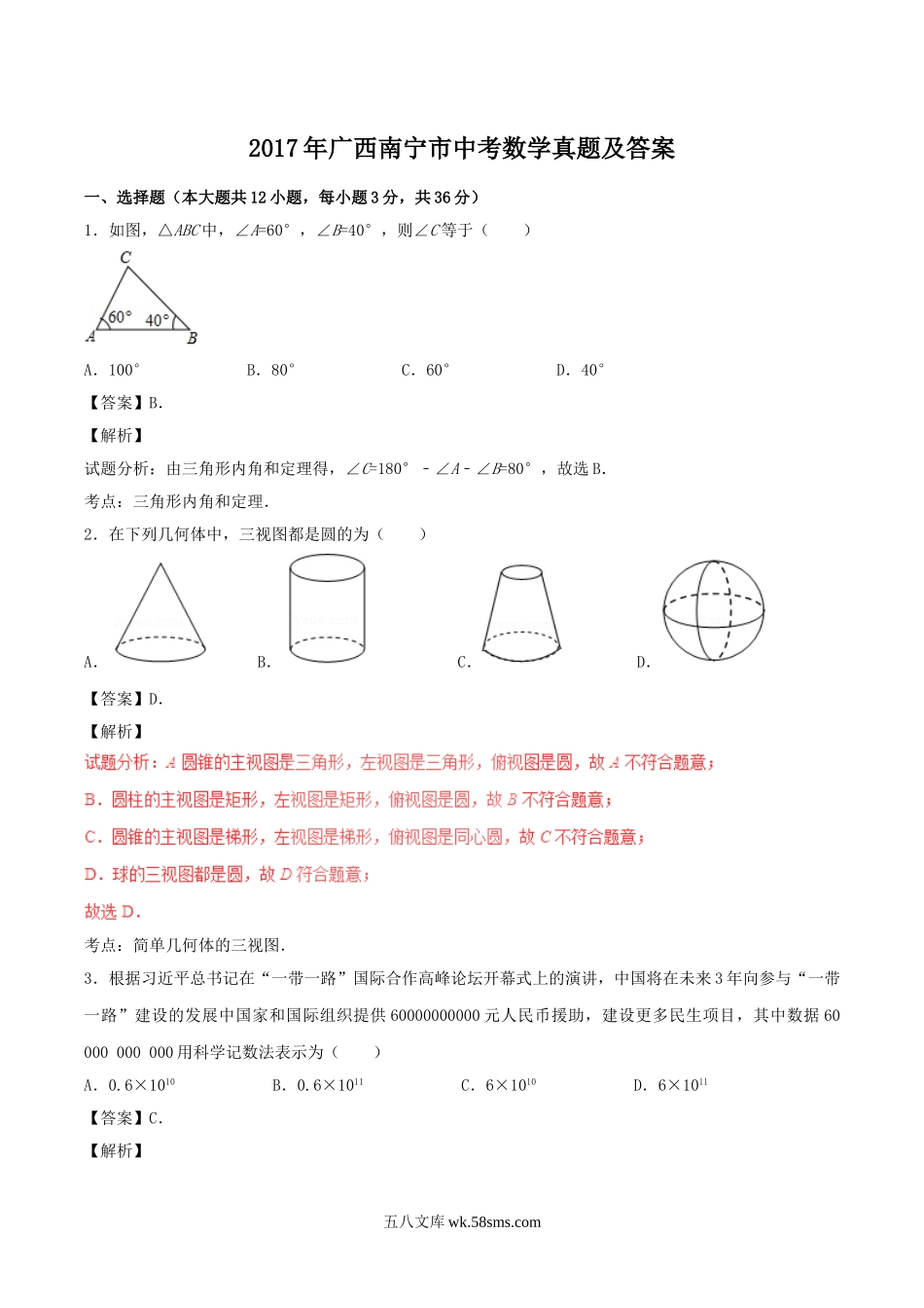 2017年广西南宁市中考数学真题及答案一、选择题(本大题共12小题,每小题3分,共36分)1.如图,△ABC中,∠A=60°,∠B=40°,则∠C等于()A.100°B.80°C.60°D.40°【答案】B.【解析】试题分析:由三角...