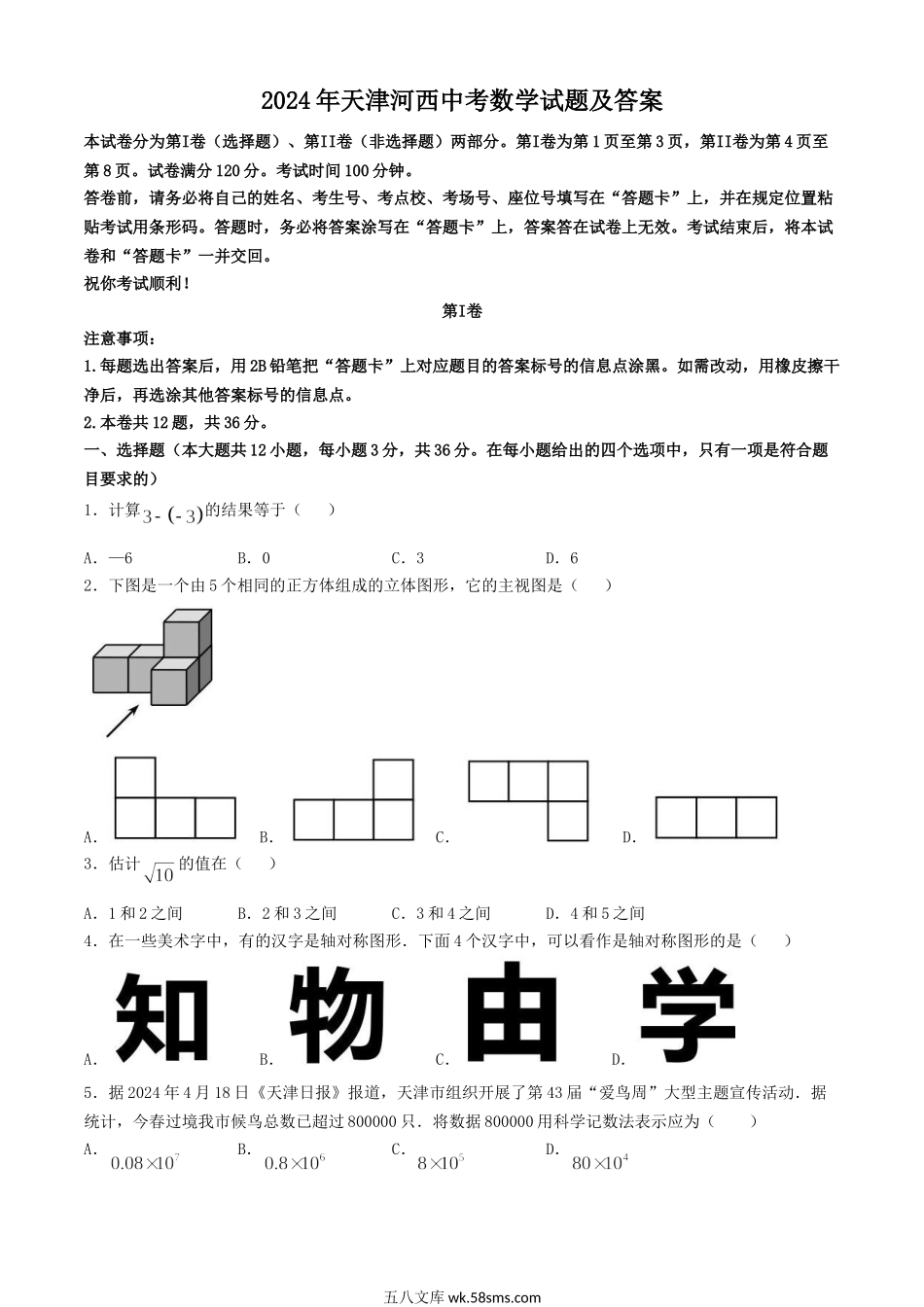 2024年天津河西中考数学试题及答案本试卷分为第I卷(选择题)、第II卷(非选择题)两部分。第I卷为第1页至第3页,第II卷为第4页至第8页。试卷满分120分。考试时间100分钟。答卷前,请务必将自己的姓名、考生号、...