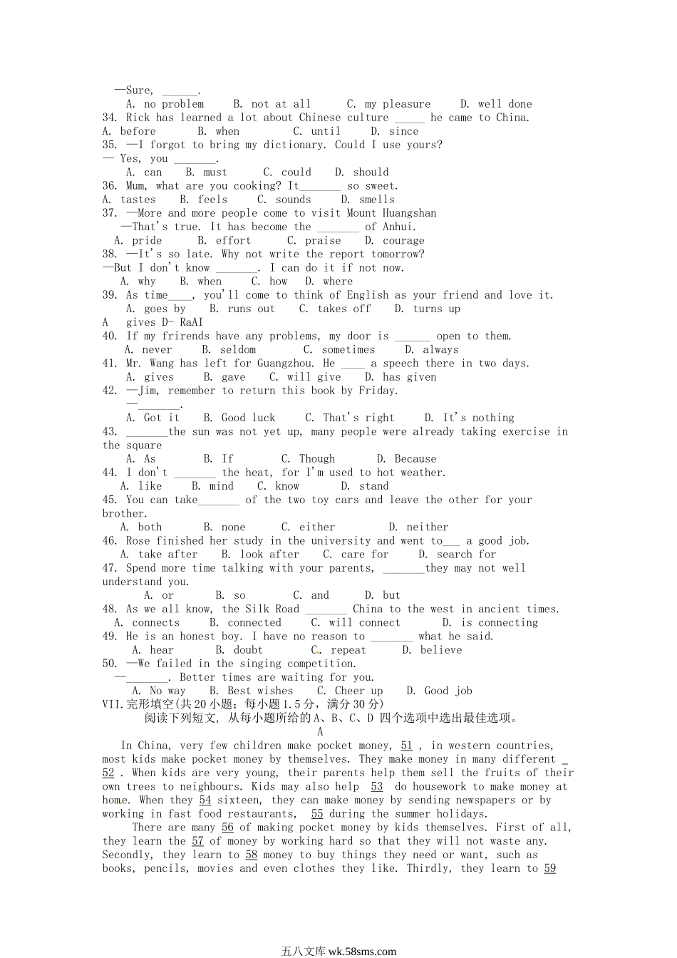 2014年安徽宣城中考英语真题及答案注意事项:1.本试卷共四部分,十一大题,满分150分。考试时间为120分钟2.全卷共有试题卷8页,答题卷2页。请将答案填写在答题卷上。3.考试结束后,请将试题卷和答题卷一并交上。...