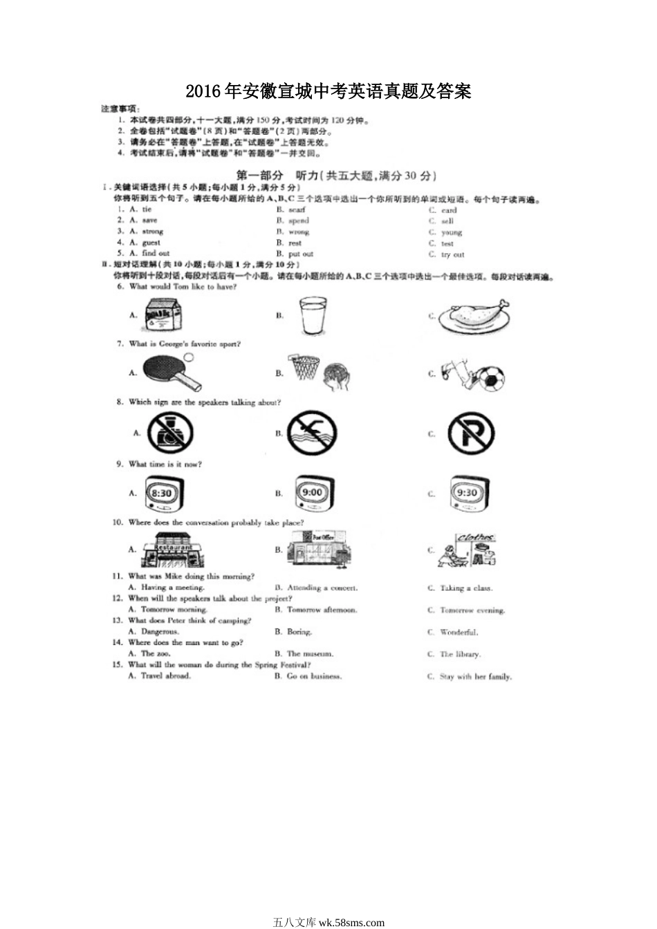2016年安徽宣城中考英语真题及答案.doc_第1页