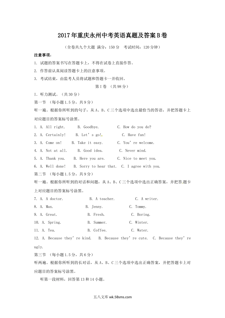 2017年重庆永州中考英语真题及答案B卷(全卷共九个大题满分:150分考试时间:120分钟)注意事项:1.试题的答案书写在答题卡上,不得在试卷上直接作答。2.作答前认真阅读答题卡上的注意事项。3.考试结束,由监考人...