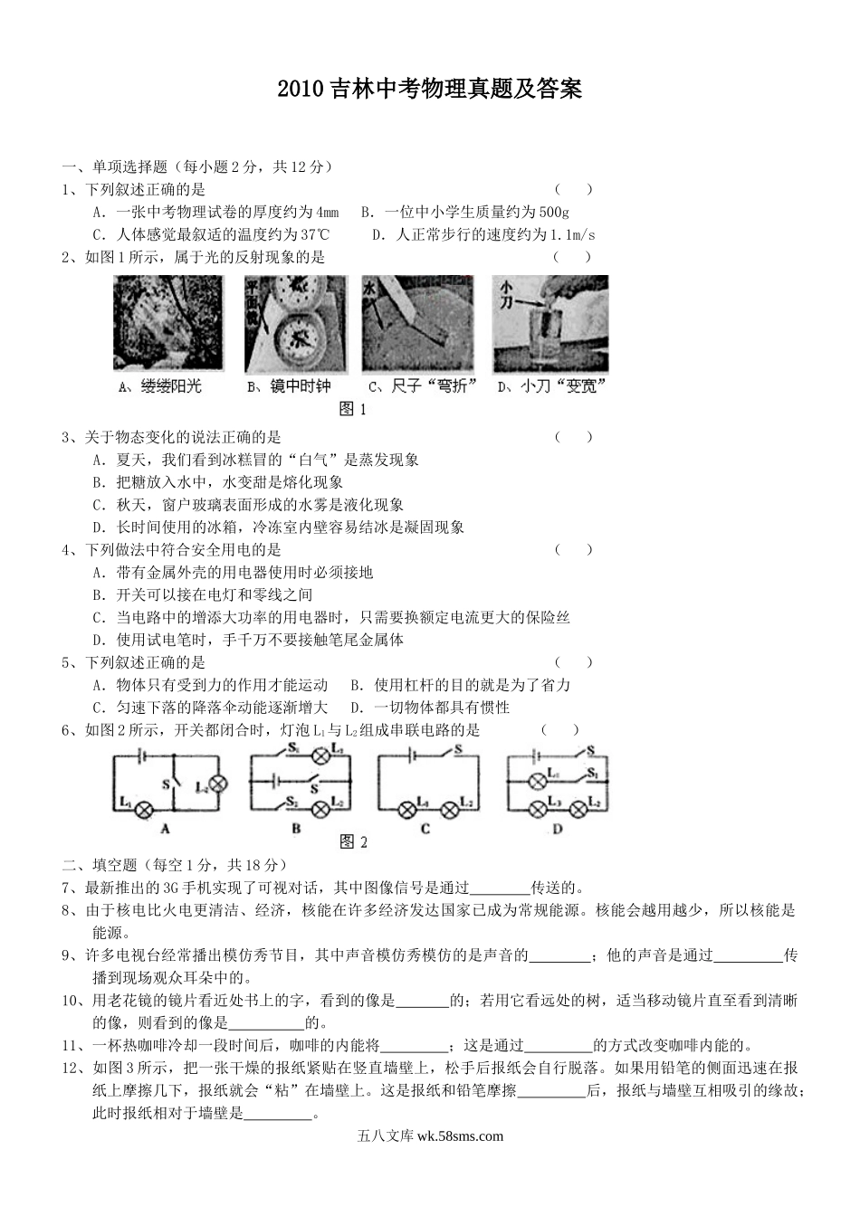 2010吉林中考物理真题及答案一、单项选择题(每小题2分,共12分)1、下列叙述正确的是()A.一张中考物理试卷的厚度约为4mmB.一位中小学生质量约为500gC.人体感觉最叙适的温度约为37℃D.人正常步行的速度约为...