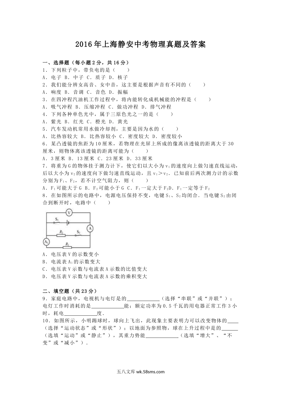 2016年上海静安中考物理真题及答案.doc优质