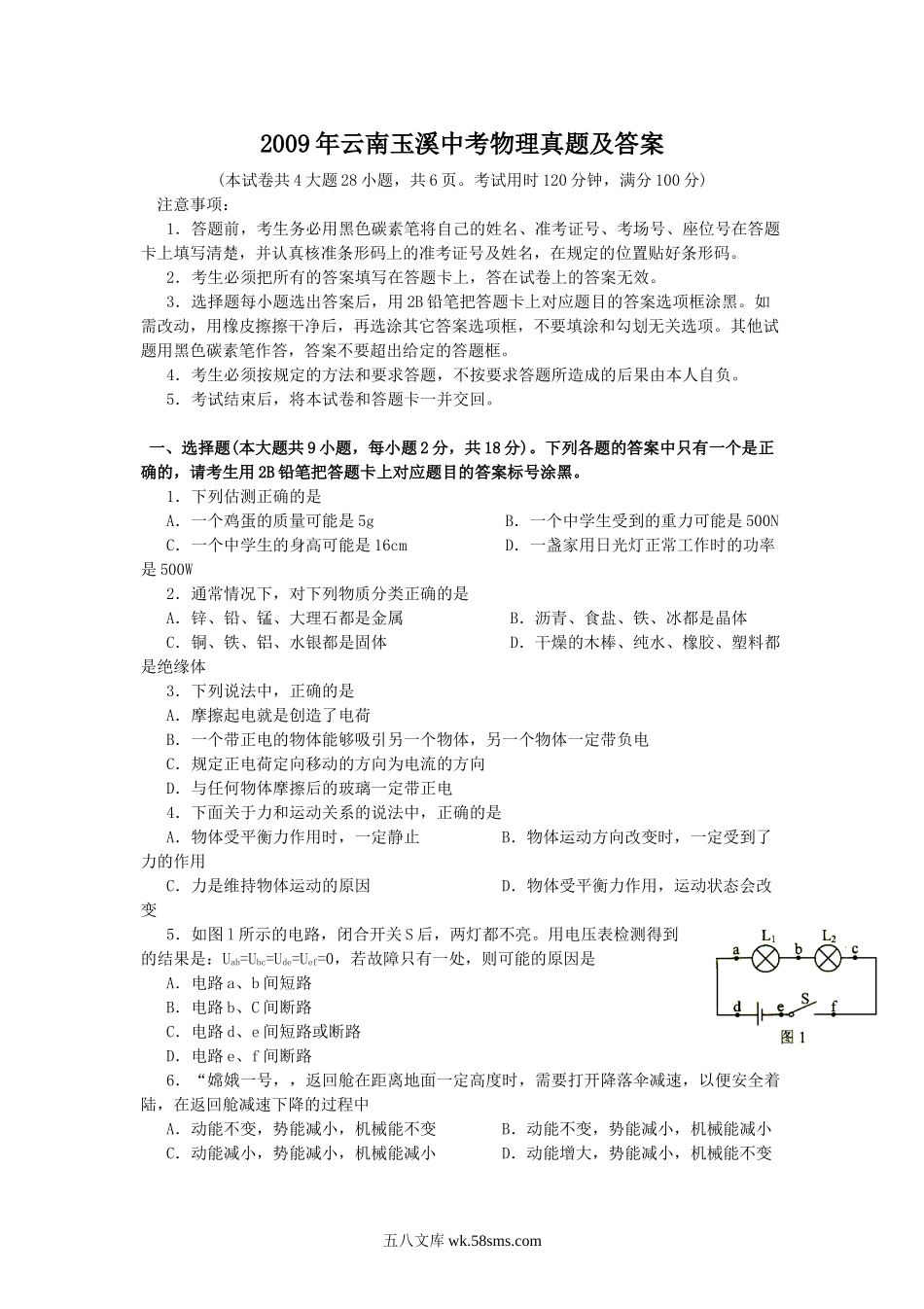 2009年云南玉溪中考物理真题及答案.doc_第1页