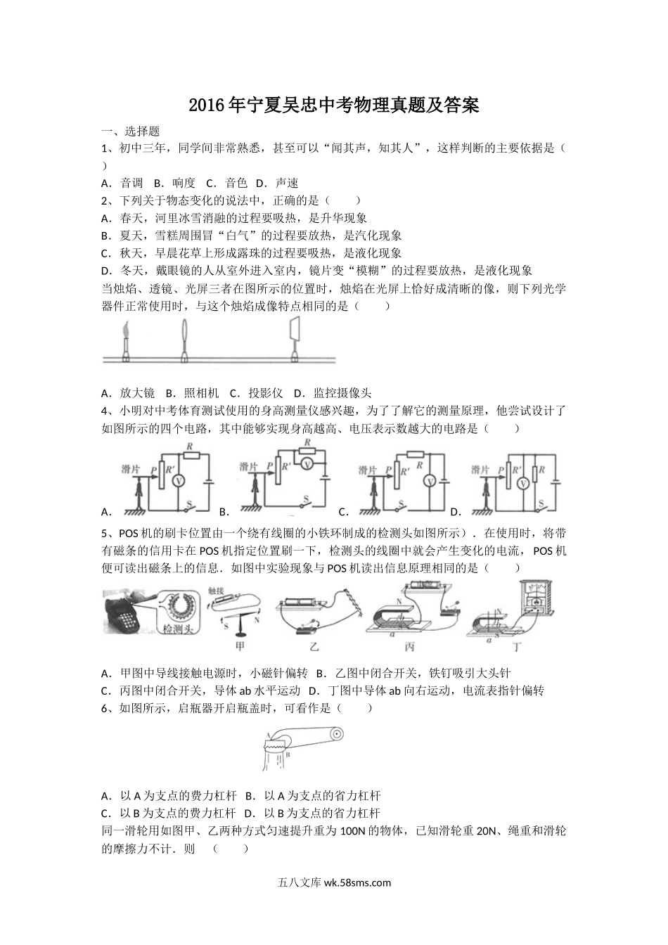 2016年宁夏吴忠中考物理真题及答案.doc优质