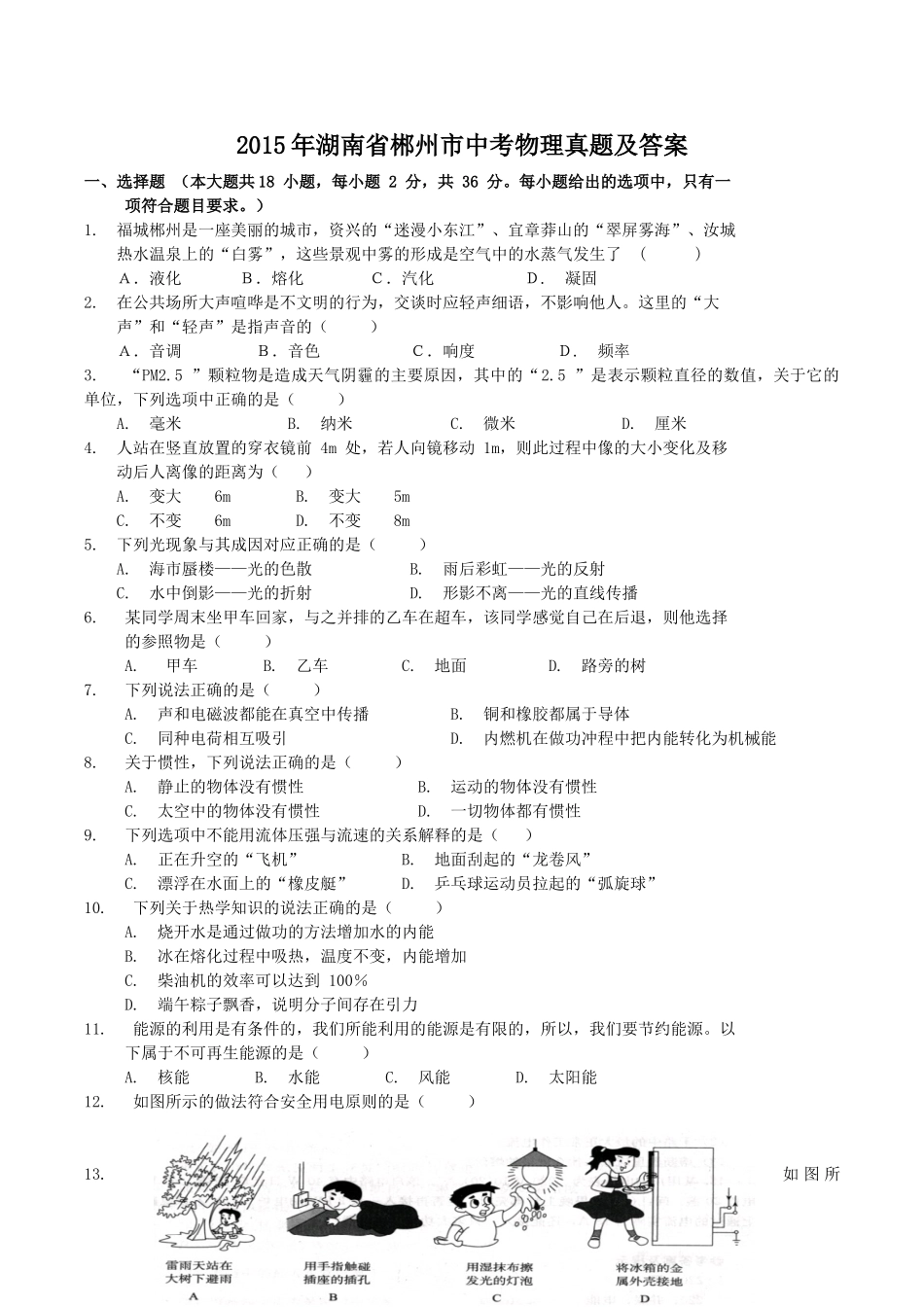 2015年湖南省郴州市中考物理真题及答案.doc_第1页