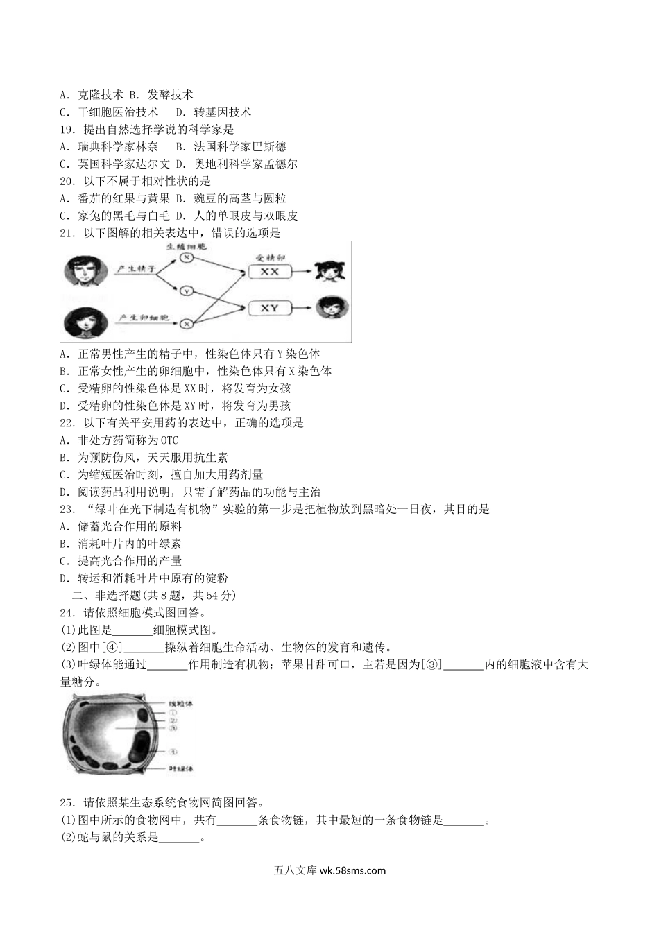 2017年天津武清中考生物真题及答案.doc_第2页