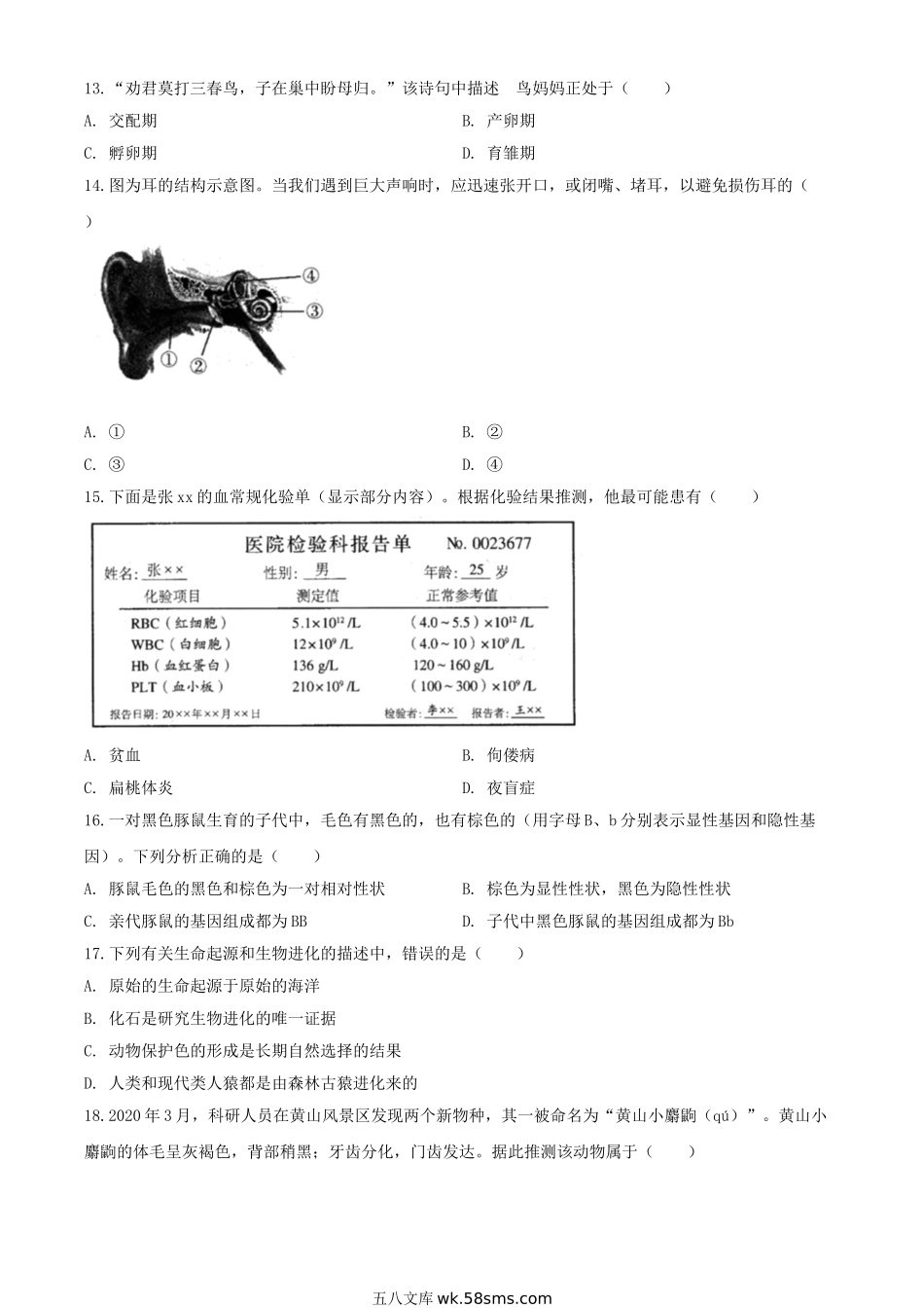 2020年河南南阳中考生物试卷及答案.doc_第2页