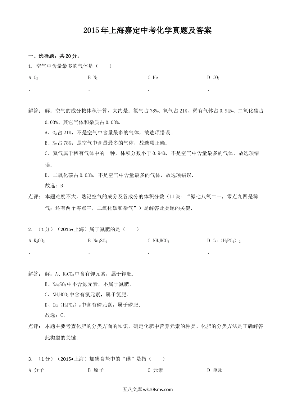 2015年上海嘉定中考化学真题及答案一、选择题:共20分。1.空气中含量最多的气体是()A.O2B.N2C.HeD.CO2解答:解:空气的成分按体积计算,大约是:氮气占78%、氧气占21%、稀有气体占0.94%、二氧化碳占0.03%...