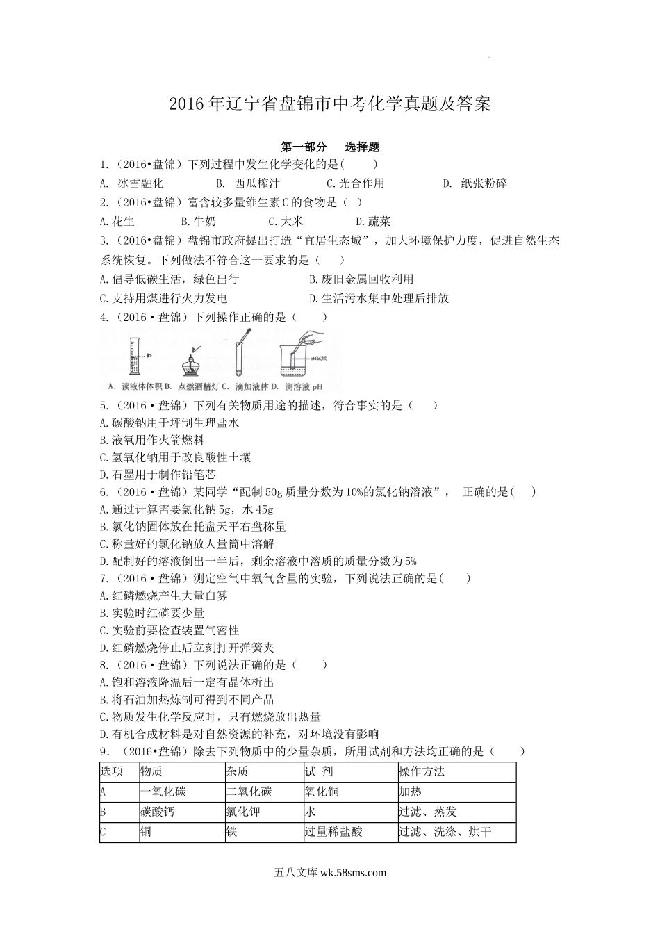 2016年辽宁省盘锦市中考化学真题及答案.doc_第1页