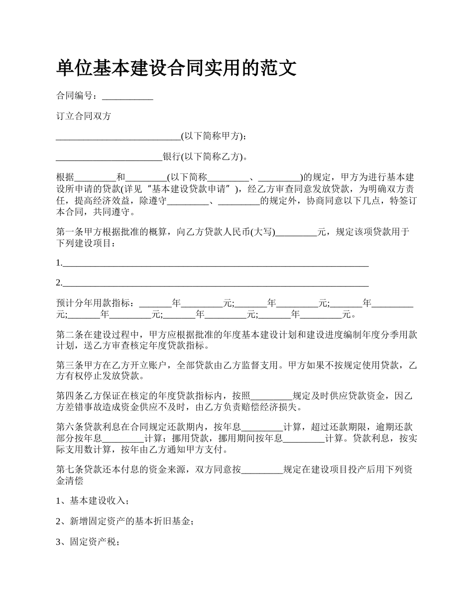 单位基本建设合同实用的范文合同编号:___________订立合同双方___________________________(以下简称甲方);_______________________银行(以下简称乙方)。根据_________和_________(以下简称_________、________...