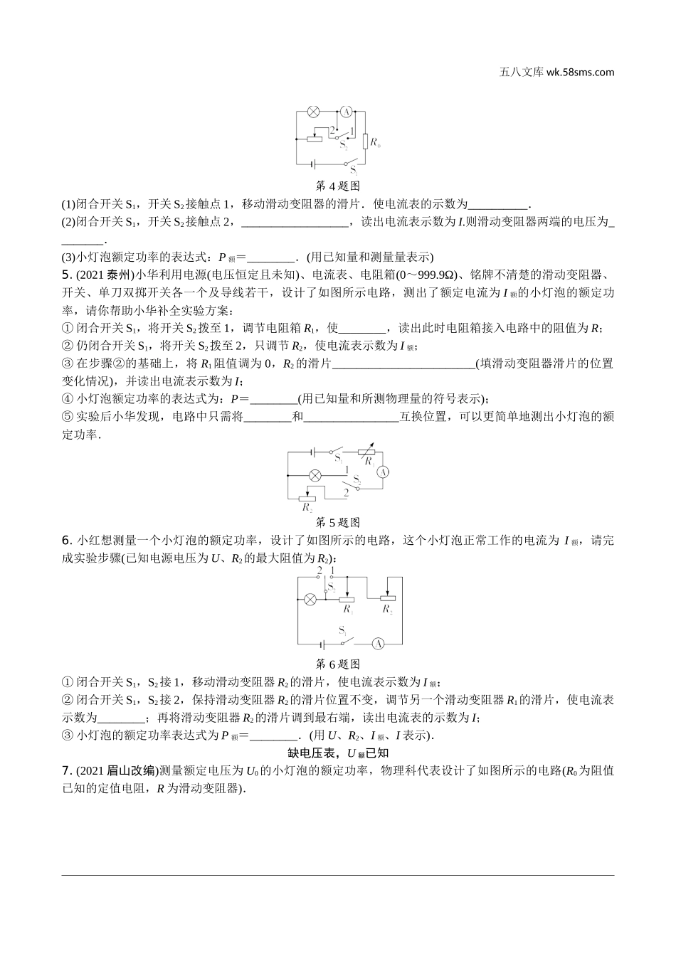 五八文库wk.58sms.com2022备考精练一、特殊方法测电阻1.(2021百色改编)小明在测量定值电阻的阻值时,若实验中只有一个电压表和一个已知阻值为R0的定值电阻,小明设计了如图所示的电路,同样可以测量未知电阻Rx的...