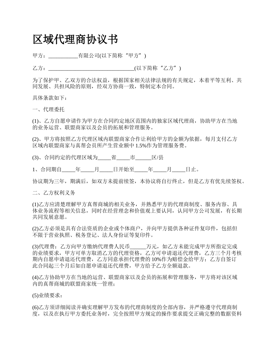 区域代理商协议书甲方:___________有限公司(以下简称“甲方”)乙方:________________________________(以下简称“乙方”)为了保护甲、乙双方的合法权益,根据国家相关法律法规的有关规定,本着平等互利、共同发...